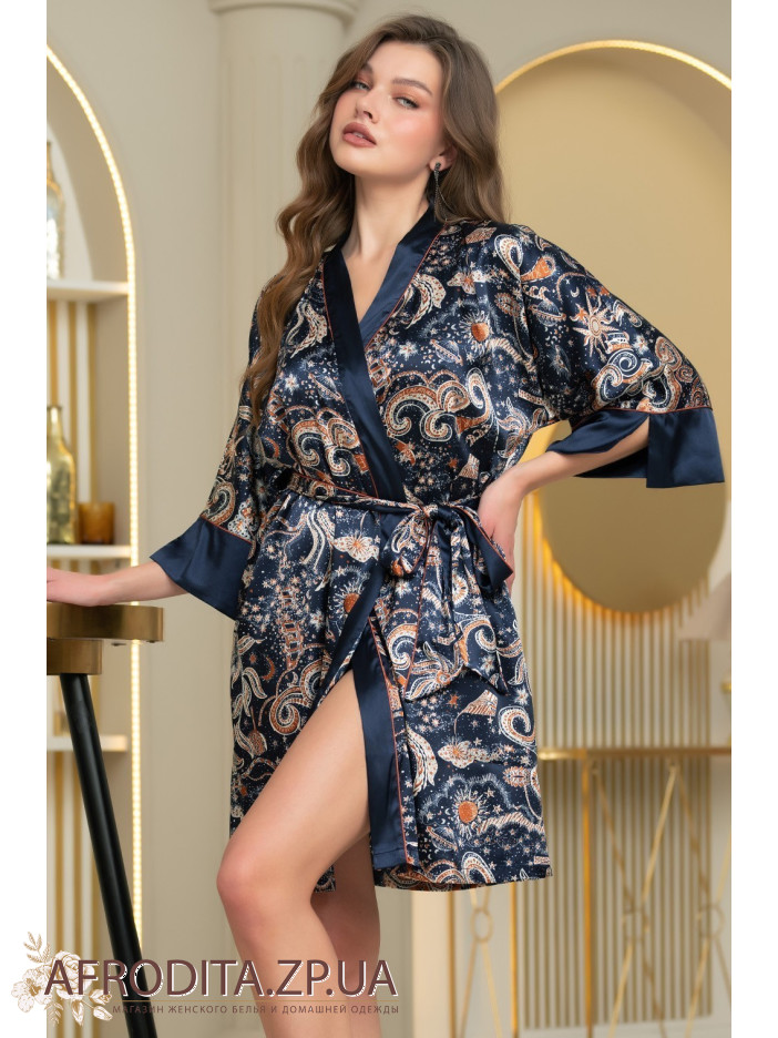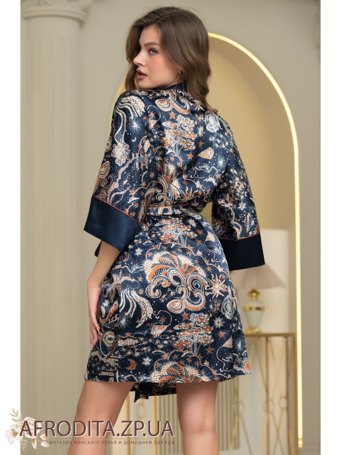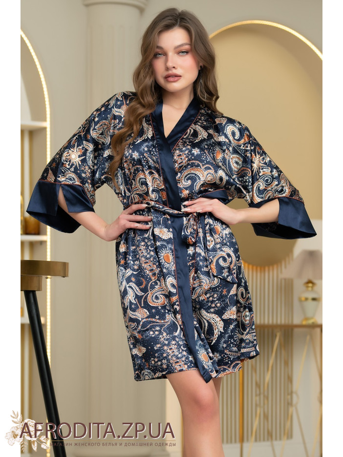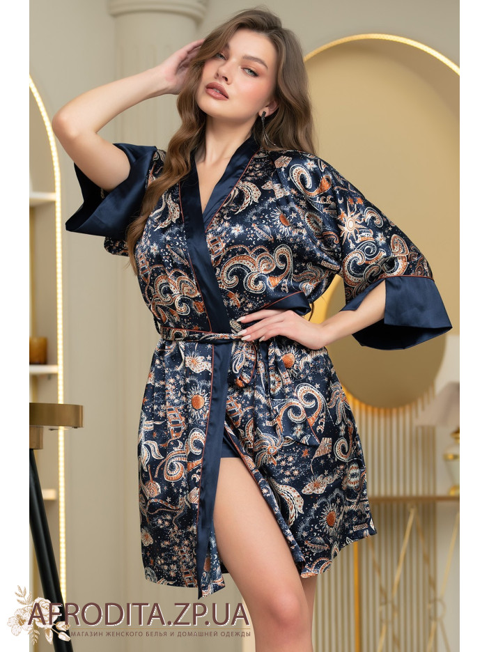 Короткий запашной халат-кимоно Зодиак 7283 от Mia-Amore с широкими длинными рукавами. Изделие выполнено из принтованного атласа с однотонной отделкой по бортам и низу рукавов, контрастный кант выступает границей между двух видов материалов. В боковых швах обработаны карманы. Изделие дополнено двухцветным поясом с кантом.