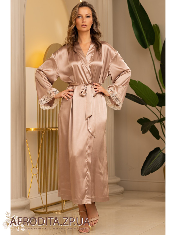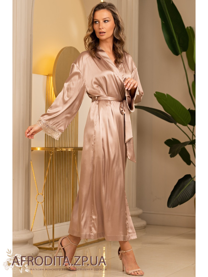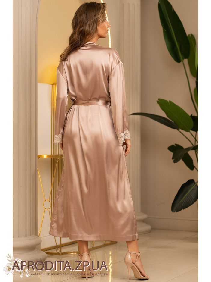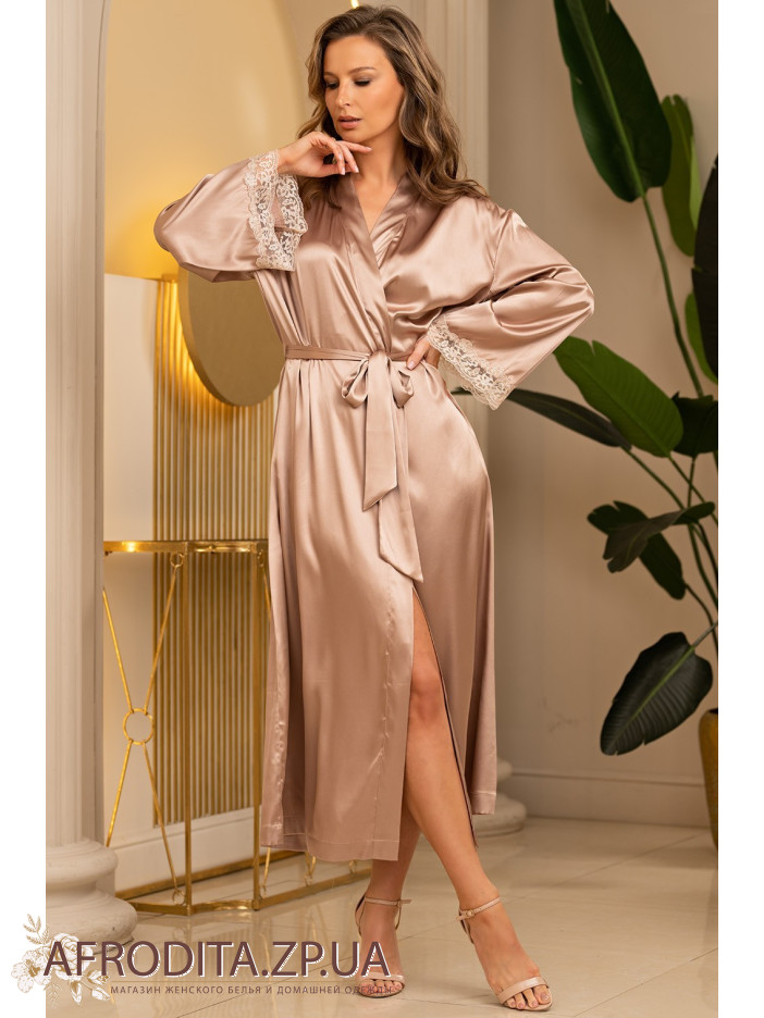 Длинный запашной халат Даниель 3879 от Mia-Amore с длинными рукавами выполнен из смесового шёлка. По низу рукава украшены вышивным широким кружевом. В боковых швах карманы, пояс завязывается широким поясом.