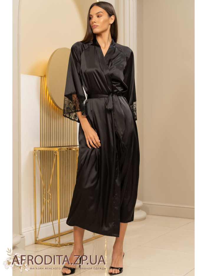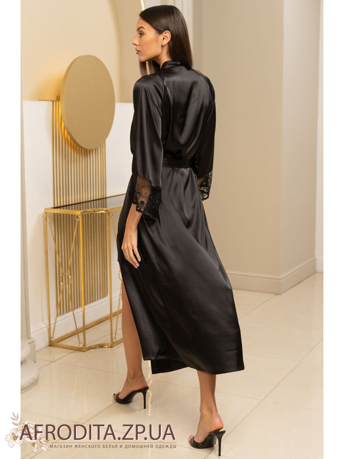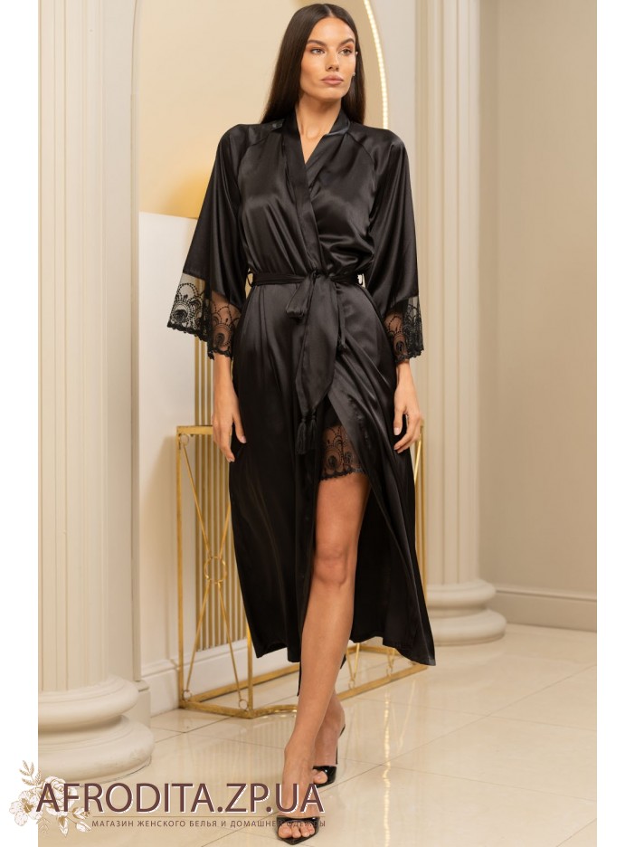 Длинный халат на запах Багира 4439 от Mia-Amore с широким длинным рукавом. Изделие выполнено из однотонного натурального шелка черного цвета. Широкое вышивное кружево, дополненное черными кристаллами Swarovski, украшает низ рукавов. По бокам халата расположены карманы. Широкий пояс с кисточками на концах идет в комплекте.