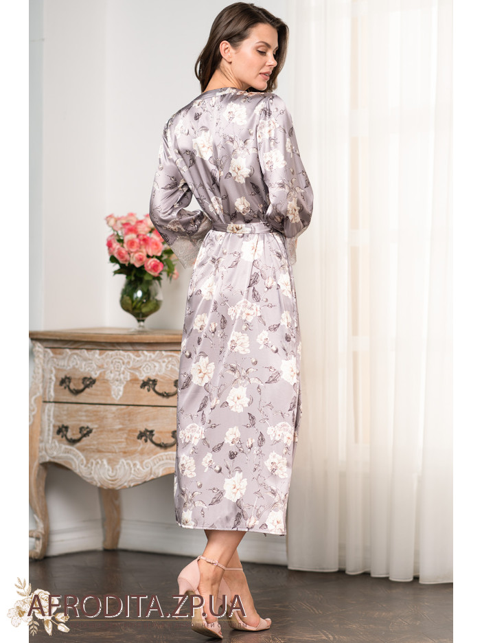 Элегантный длинный халат Mia-Amore на пуговицах и с V-образным вырезом из смесового шелкового полотна с изящным принтом. Низ рукавов ¾ украшен широкой полосой кружева.