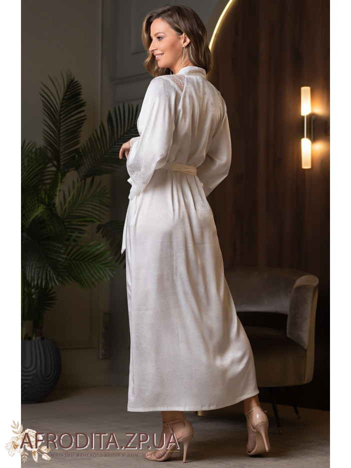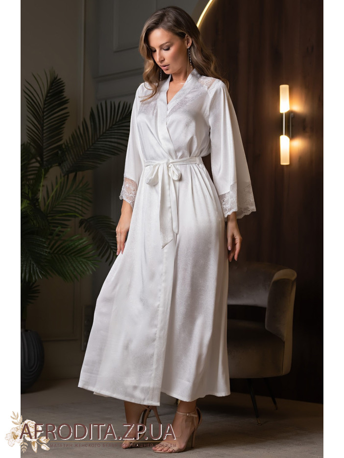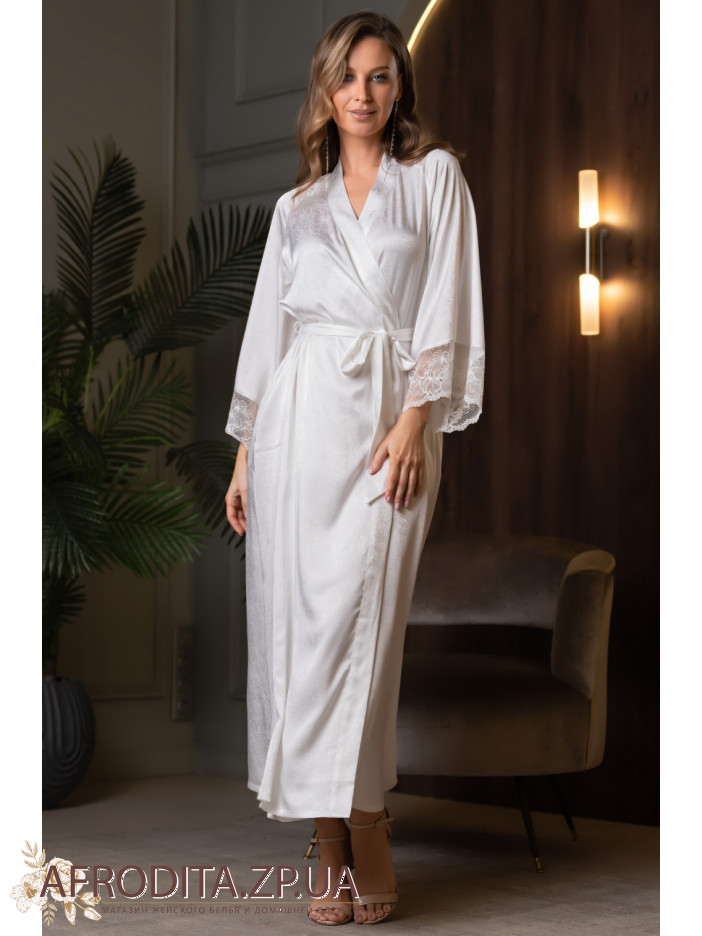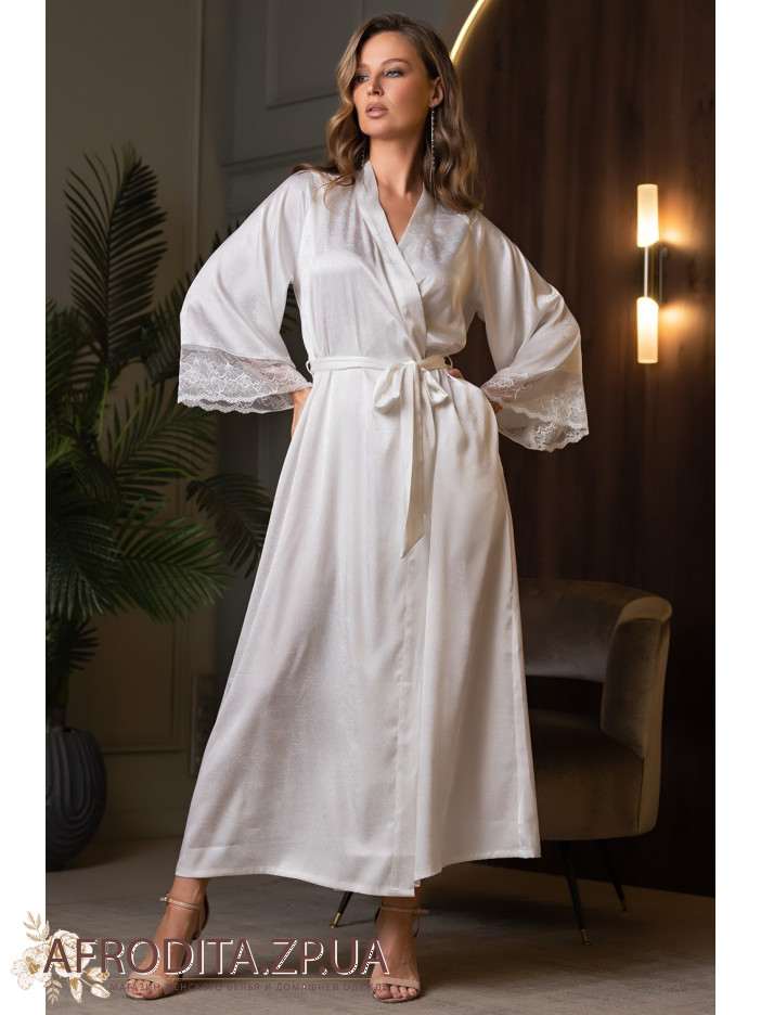 Элегантный длинный халат Мелани 7279 Mia-Amore с длинными широкими рукавами, выполнен из однотонного искусственного шелка на жаккардовой основе и дополнен кружевными вставками, расположенными по верху и низу рукавов. С обеих сторон расположены карманы.