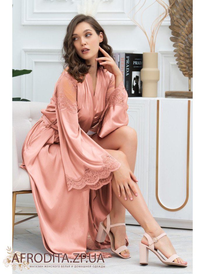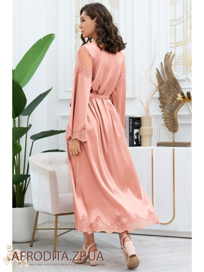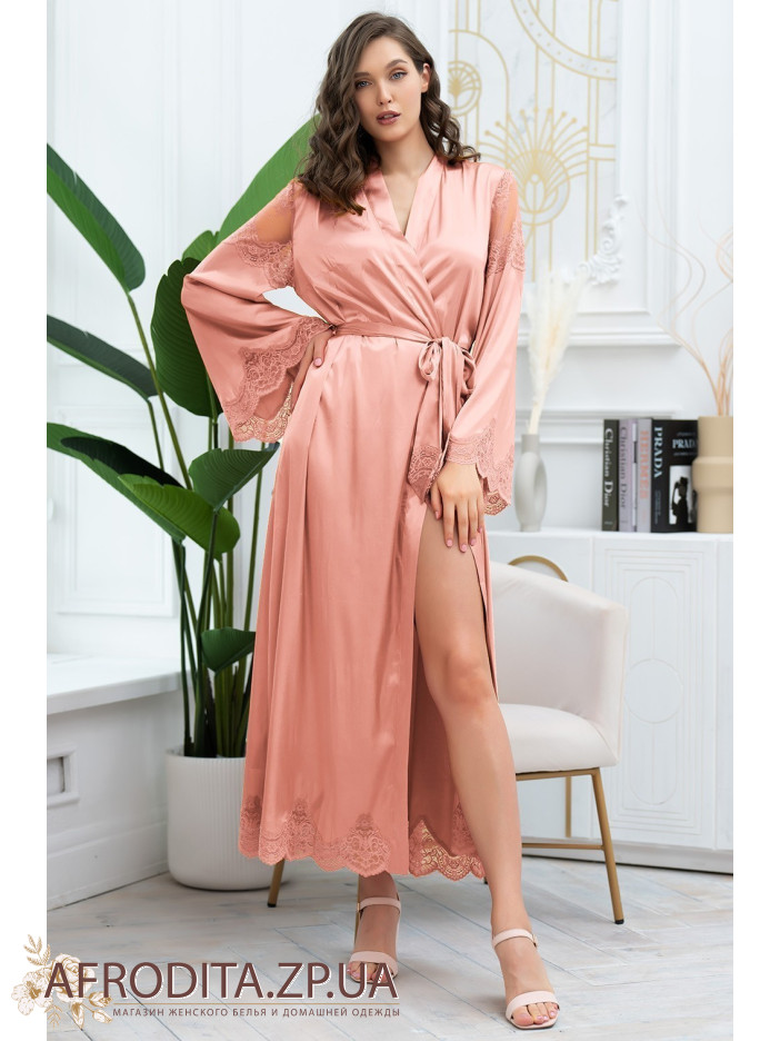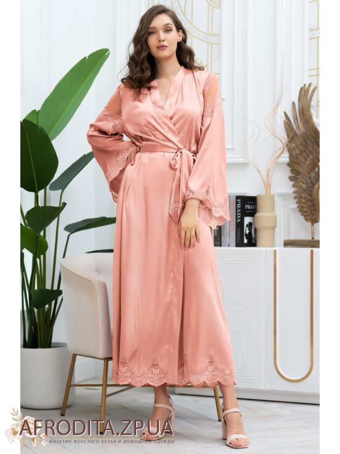 Длинный женственный халат на запах Аурелия 3899 от Mia-Amore с широкими рукавами, выполнен из однотонного смесового шелка и декорирован ажурным кружевом, которое расположено по низу рукавов и низу изделия. В боковых швах обработаны карманы. Концы широкого пояса украшены кружевом.