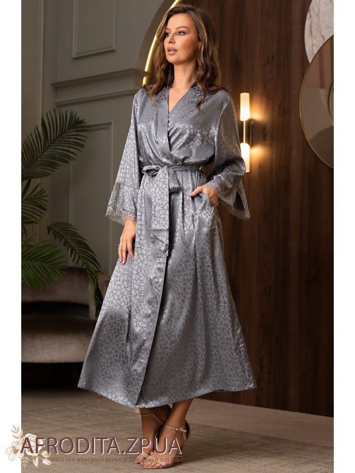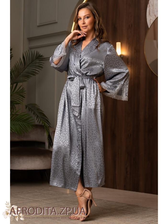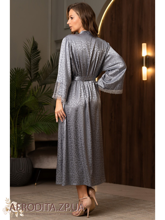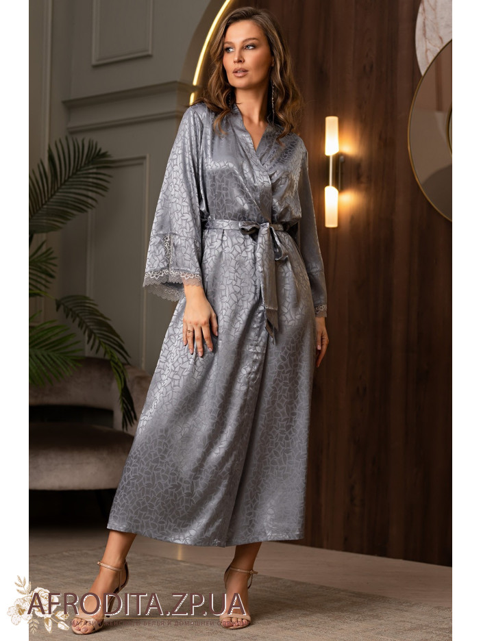 Длинный запашной халат-кимоно Джоанна 7319 от Mia-Amore с широкими рукавами длиной ¾. Халат выполнен из однотонного искусственного шелка на жаккардовой основе. Низ рукавов украшен ажурным кружевом. В боковых швах расположены карманы. Линия талии подчеркивается за счет широкого пояса.