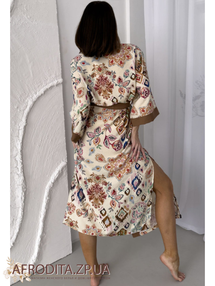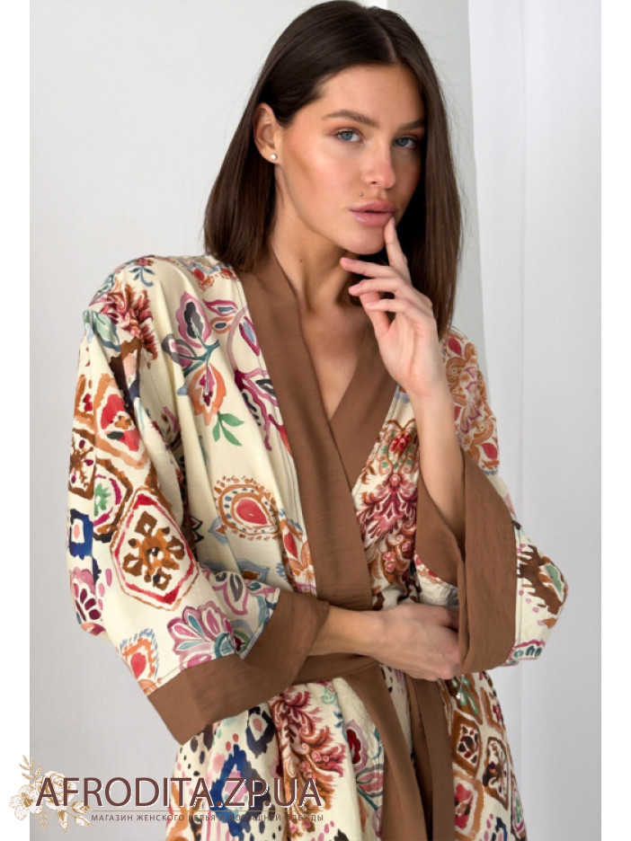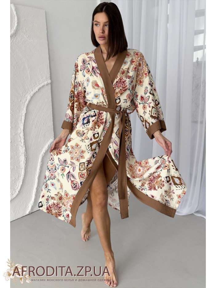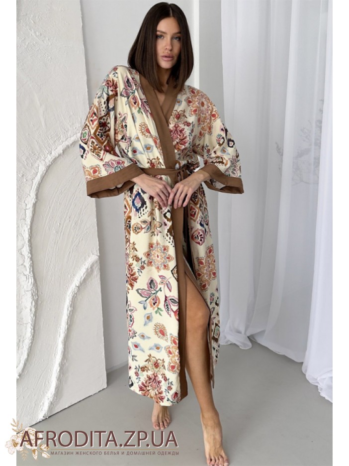 Женский длинный халат из вискозы от украинского бренда Cosy. Халат на запах длинной ниже колен, борт изделия и края рукавов декорированы контрастной тканью кофейного цвета. Халат с боковыми разрезами, линию талии можно регулировать при помощи пояса. Оригинальный цветочный принт с элементами геометрического орнамента придает неповторимый шик и изюминку данному изделию. Халат упакован в фирменную коробку.