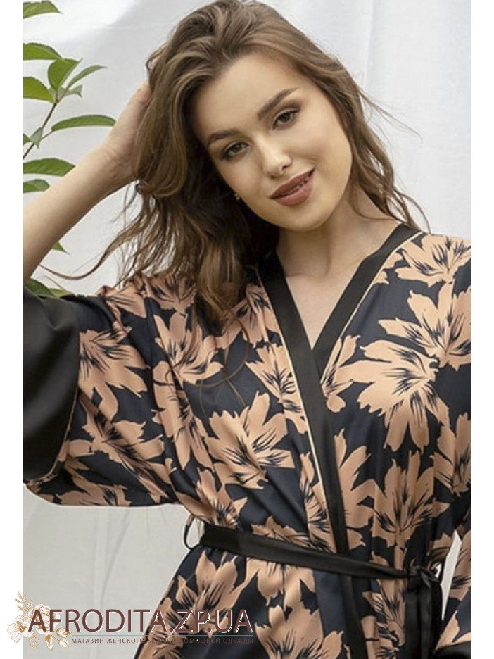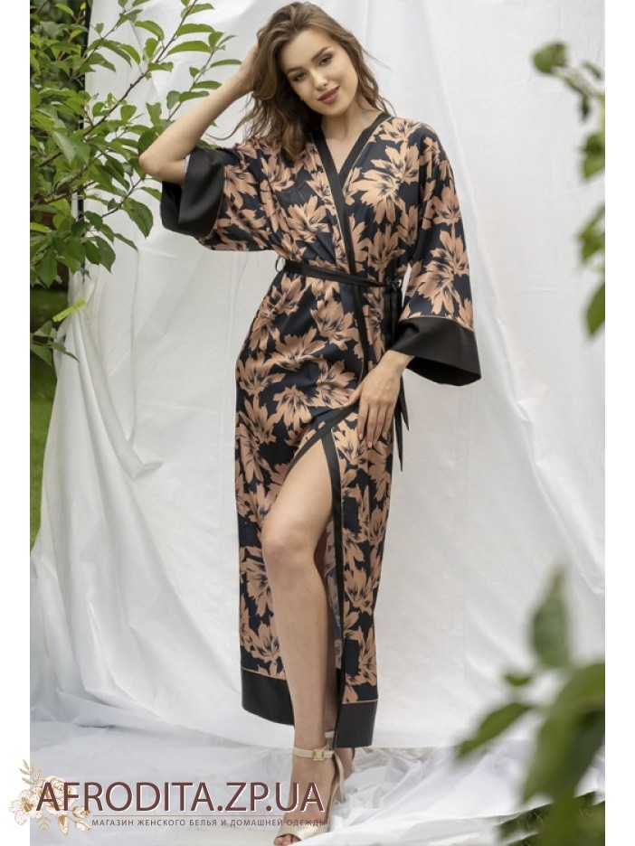 Женский длинный халат Shato 2305 из атласного шелка. Халат на запах, рукава и борт изделия декорированы тканью в то изделия. В комплекте прилагается пояс.