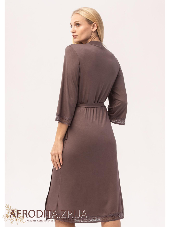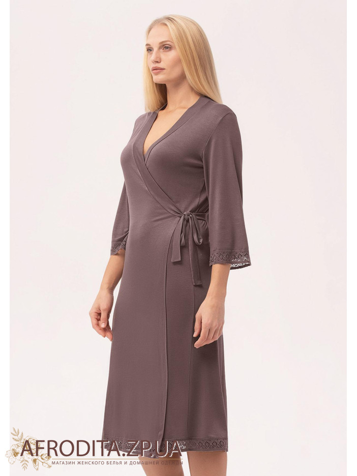 Женский домашний халат 1365-60868 ниже колен, изготовленный из вискозного полотна. Халат на запах, длинна рукава 3/4 края декорированы кружевом. Линия талии регулируется поясом.