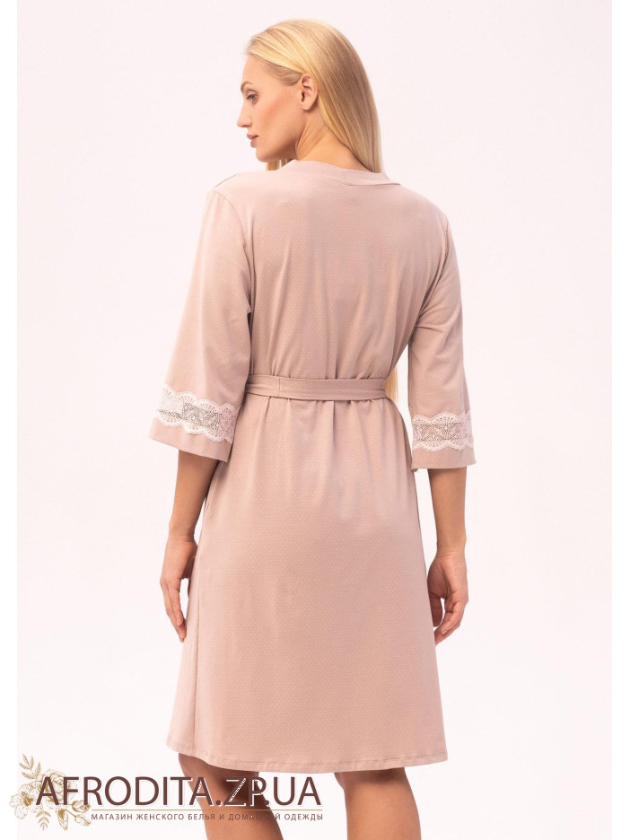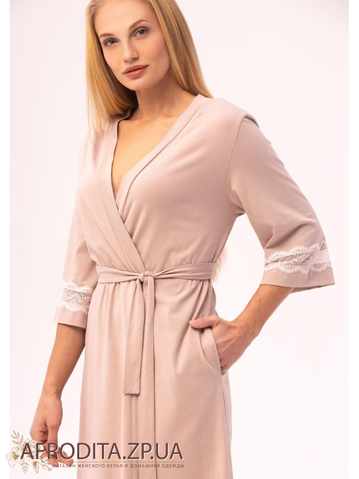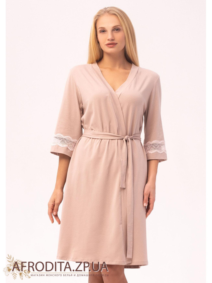 Женский домашний халат на запах 1368-16305 изготовленный из однотонной хлопковой ткани нежно-бежевого цвета. Халат до колен, в боковых швах расположены карманы, рукава декорированы тонкими кружевными вставками.