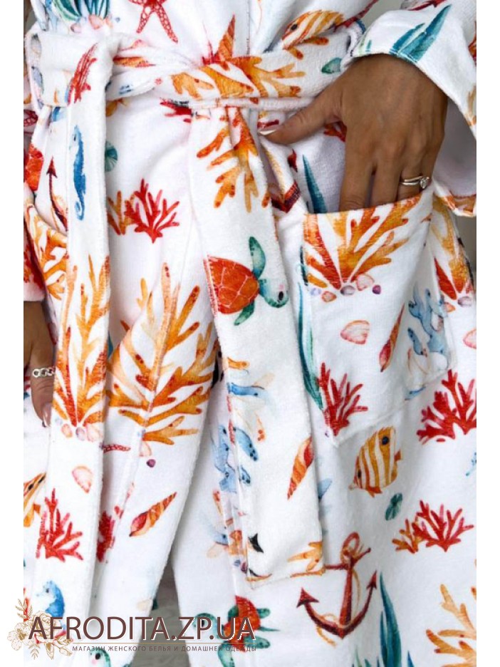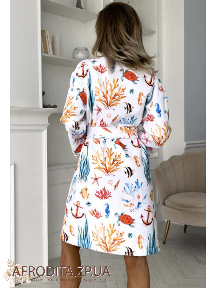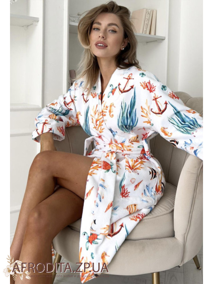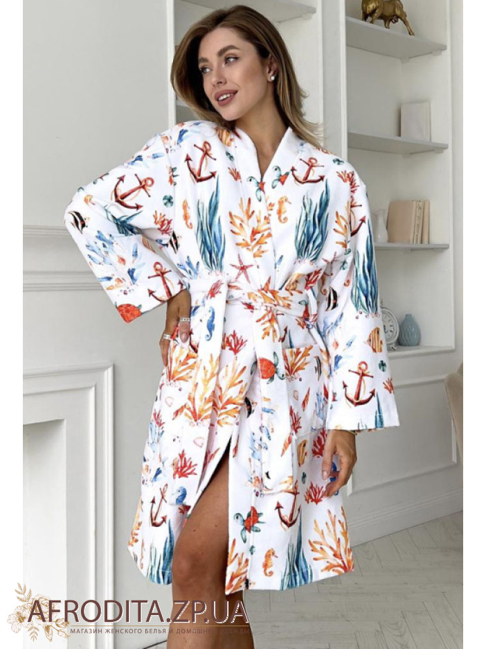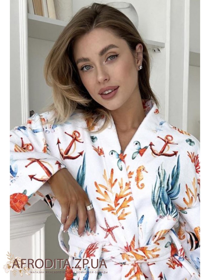Женский махровый халат от украинского бренда Cosy. Принт халата изготовлен в морском стиле, длинна изделия до колен. Модель свободного кроя на запах с длинными рукавами, линия талии регулируется поясом. По бокам изделия расположены карманы. Морской принт придает изюминку этой модели. Халатик очень мягкий и приятный к телу и может служить хорошим подарком близкому человеку.