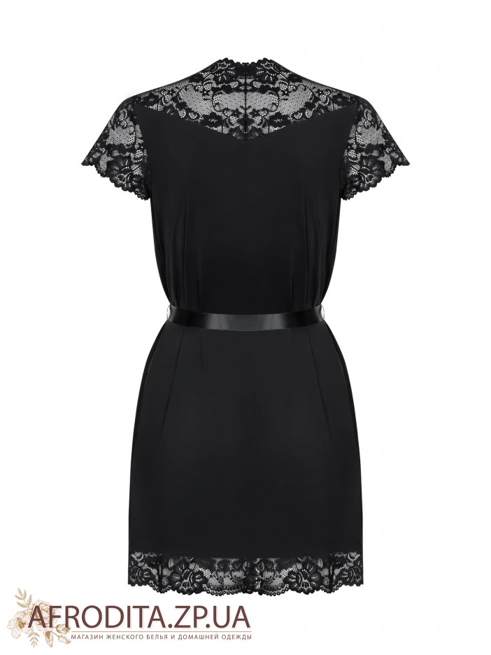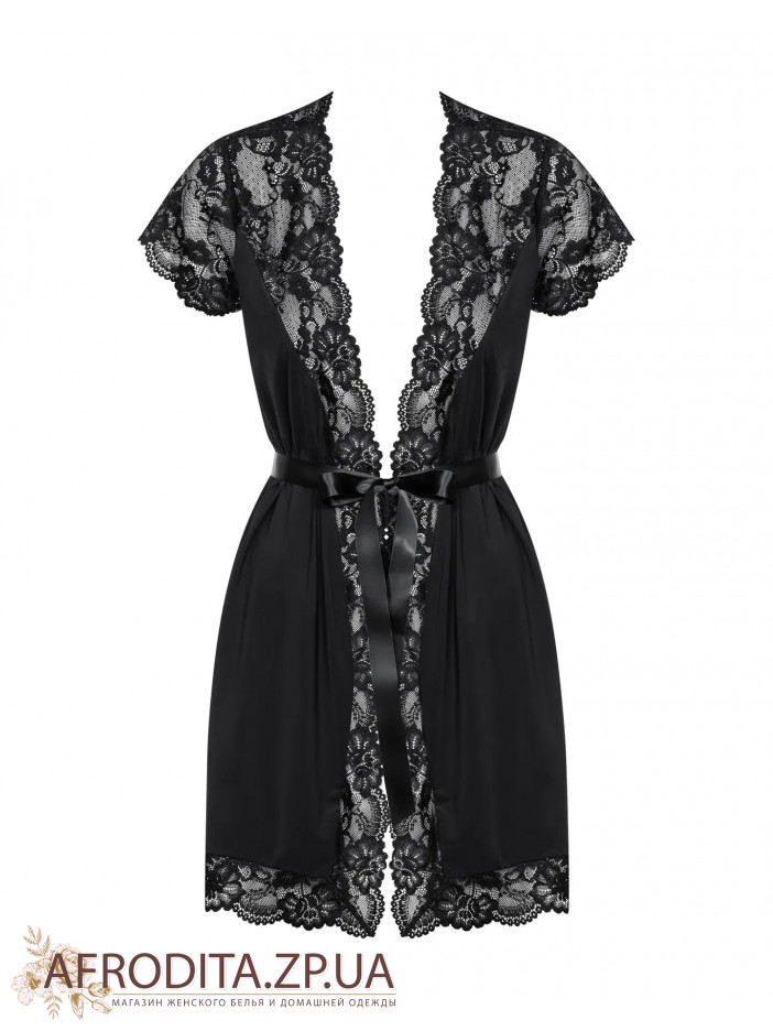 Женский сексуальный халат 810-PEI-1 черного цвета из мягкого полиамида. Халат выше колен с короткими кружевными рукавами, борт изделия и нижняя часть также декорированы кружевом. Линия талии регулируется атласным поясом.