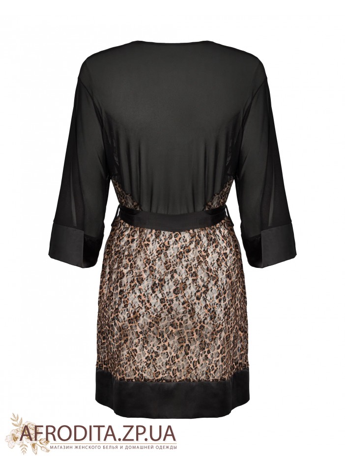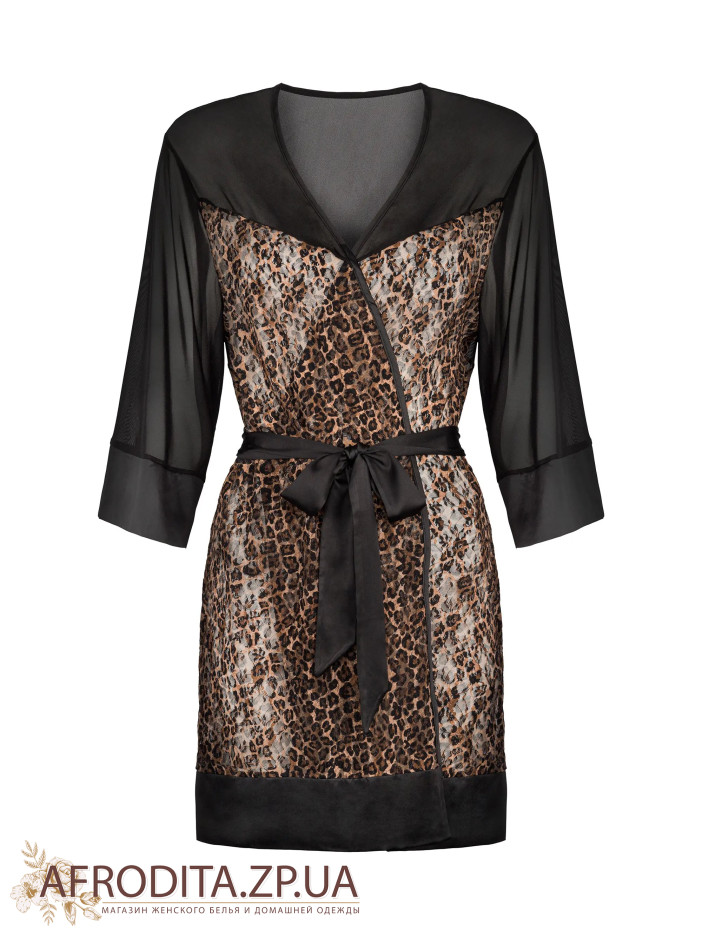 Женский сексуальный халат ALLUNES PEIGNOIR из очень приятной к телу ткани в леопардовой расцветке. Рукава из прозрачного шифона с длинной 3/4. Спинка изделия также изготовлена из прозрачной ткани. В комплекте прилагается атласный пояс для регулировки линии талии.
