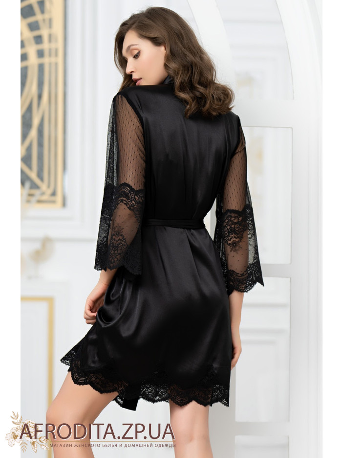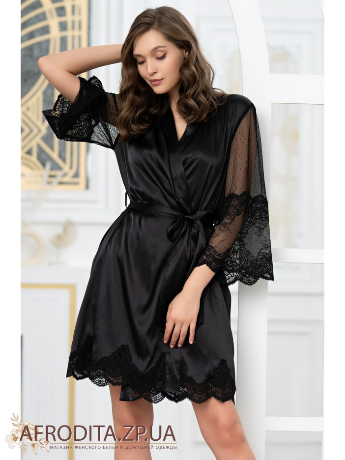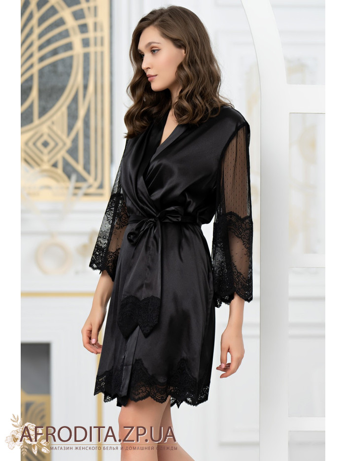 Короткий халат на запах Аурелия 3893-1 от Mia-Amore с длинными полупрозрачными рукавами. Халат выполнен из однотонного смесового шелка и декорирован ажурным кружевом, которое расположено по низу рукавов и низу изделия. По бокам обработаны карманы. Концы широкого пояса украшены кружевом.