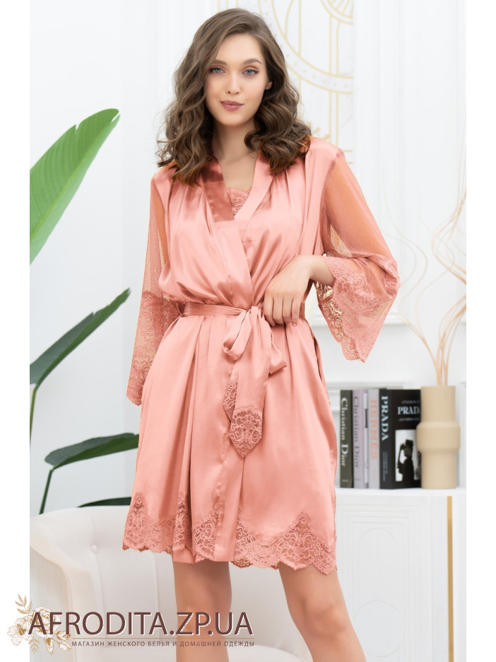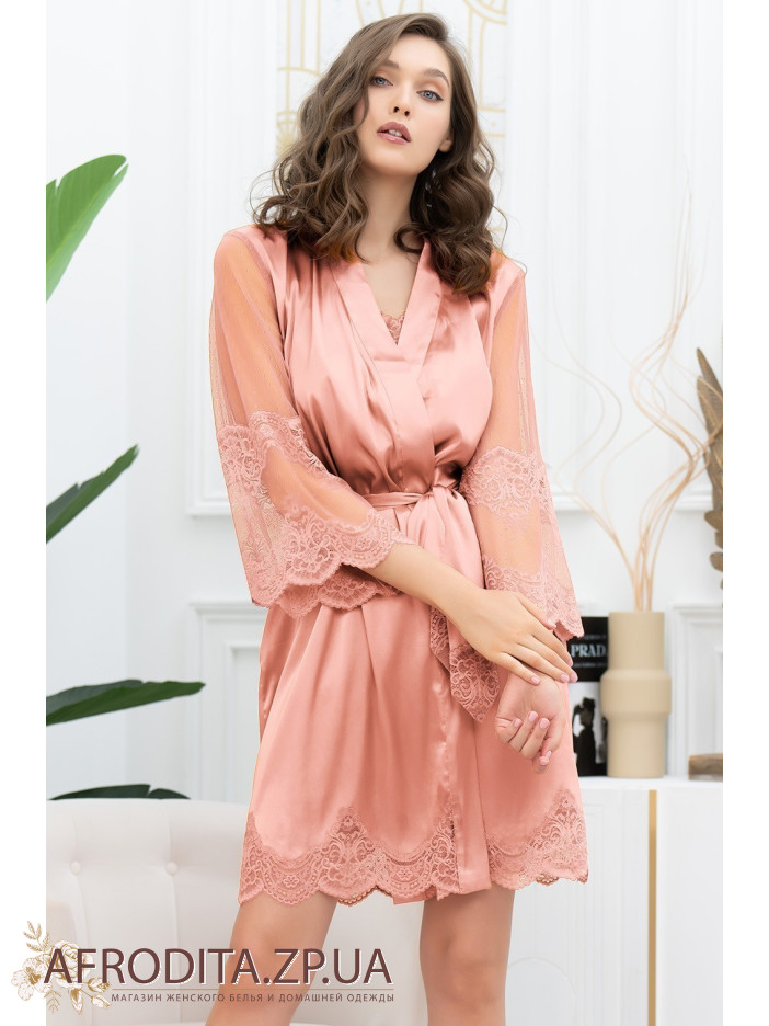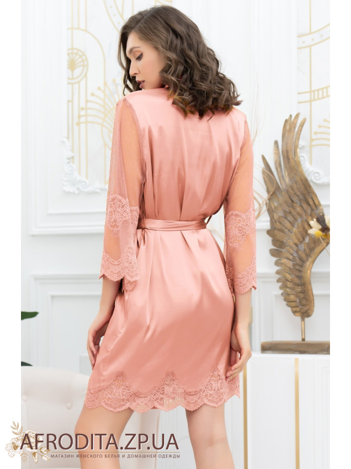 Короткий халат на запах Аурелия 3893 от Mia-Amore с длинными полупрозрачными рукавами. Халат выполнен из однотонного смесового шелка и декорирован ажурным кружевом, которое расположено по низу рукавов и низу изделия. По бокам обработаны карманы. Концы широкого пояса украшены кружевом.