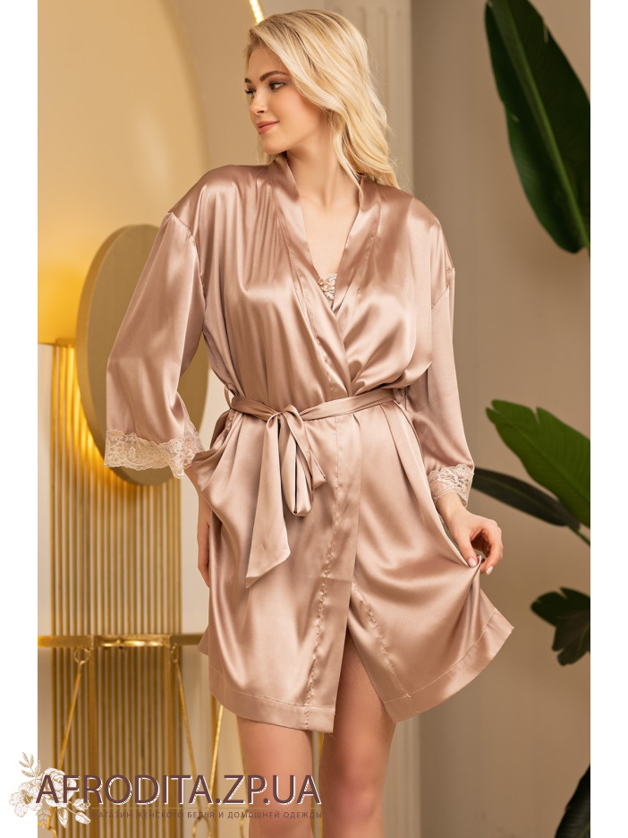 Короткий запашной халат Даниель 3873 от Mia-Amore с рукавами длиной 7/8 выполнен из смесового шёлка. По низу рукава украшены вышивным широким кружевом. В боковых швах карманы, пояс завязывается широким поясом.