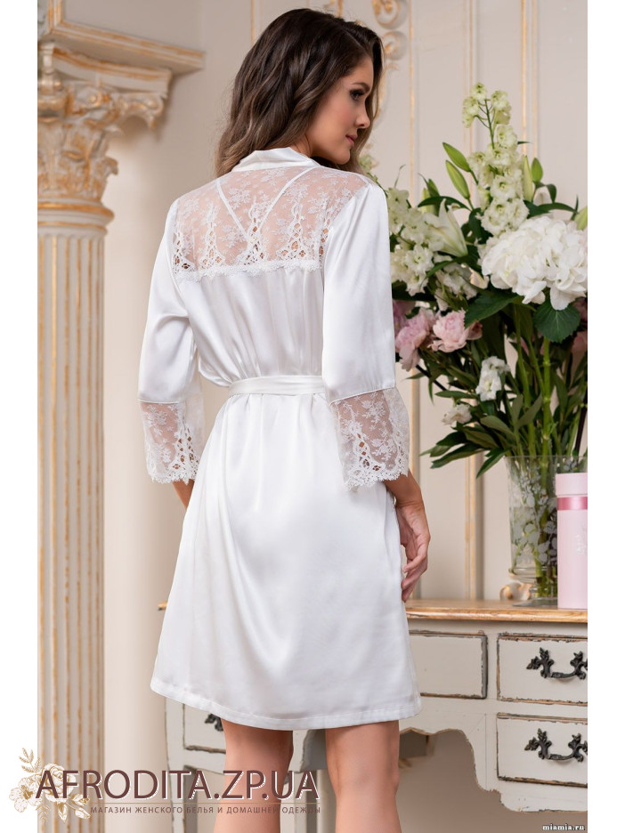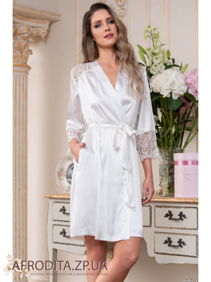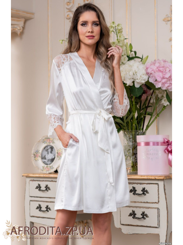Женский шелковый халат Эдита от Mia-Amore с рукавами длиной ¾, выполнен из смесового однотонного шелка. Вставки из французского кружева украшают кокетки полочек и спинки, а также низ рукавов. По бокам обработаны карманы.