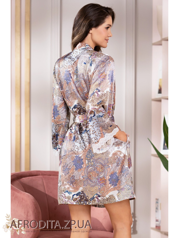 Короткий запашной халат Миа 3863 от Mia-Amore с широким длинным рукавом, выполнен из принтованного смесового шелка и декорирован ажурным кружевом, которое расположено по низу рукавов. По бокам обработаны карманы.