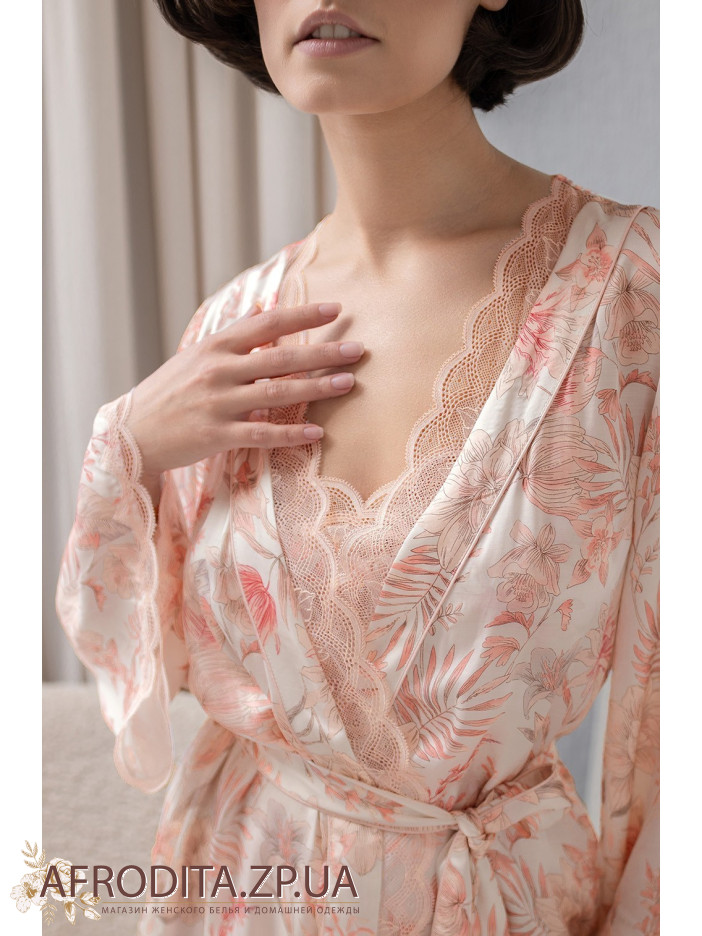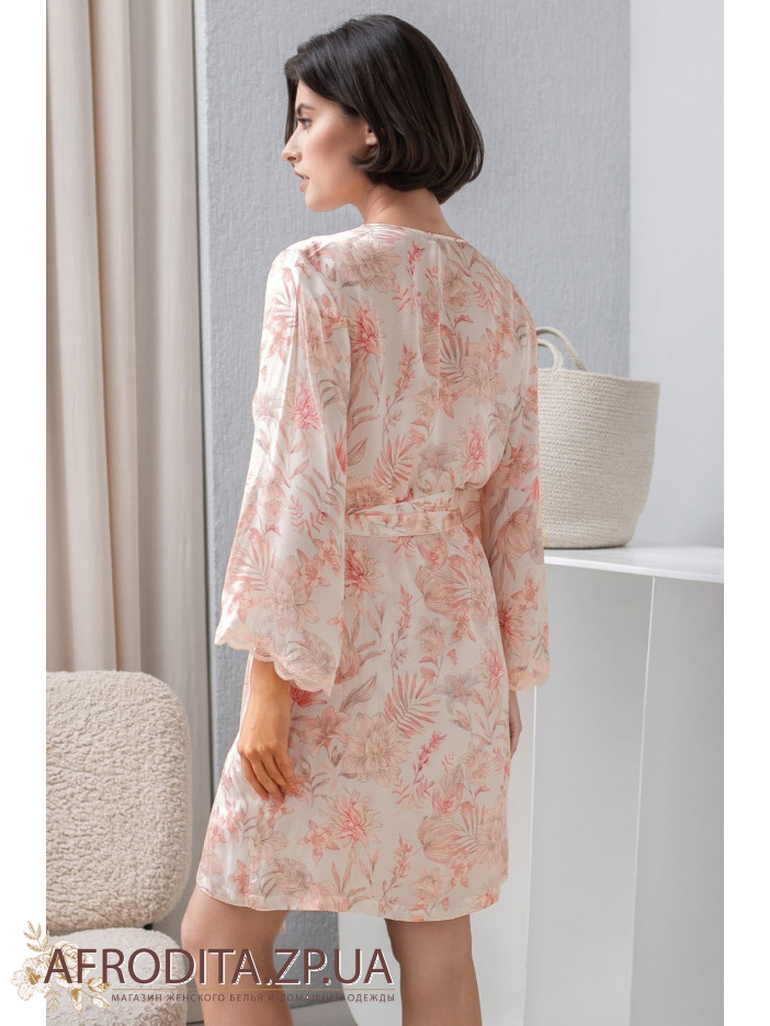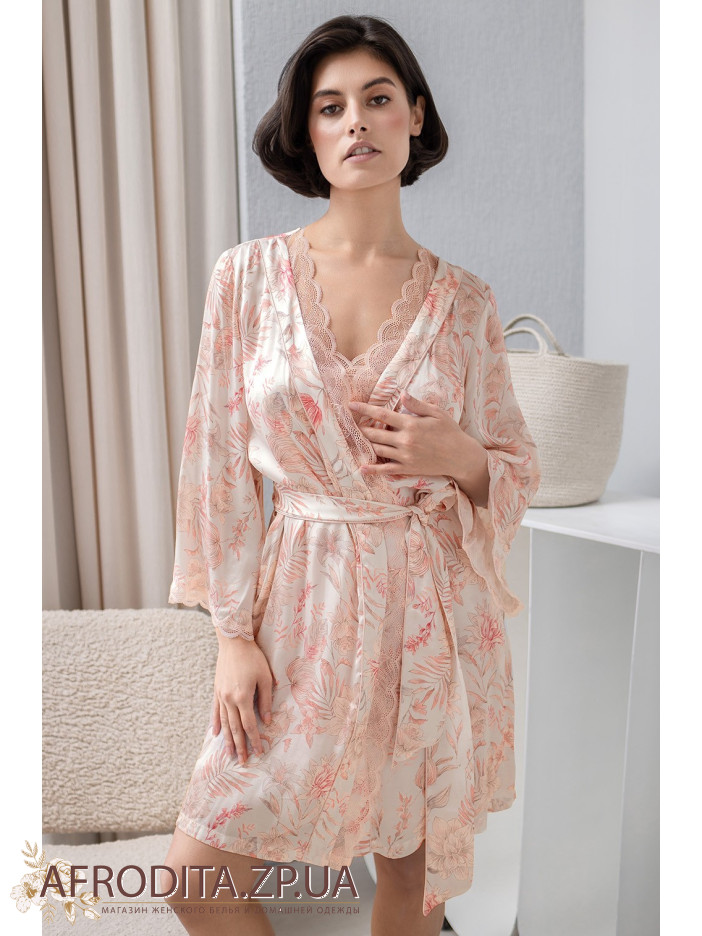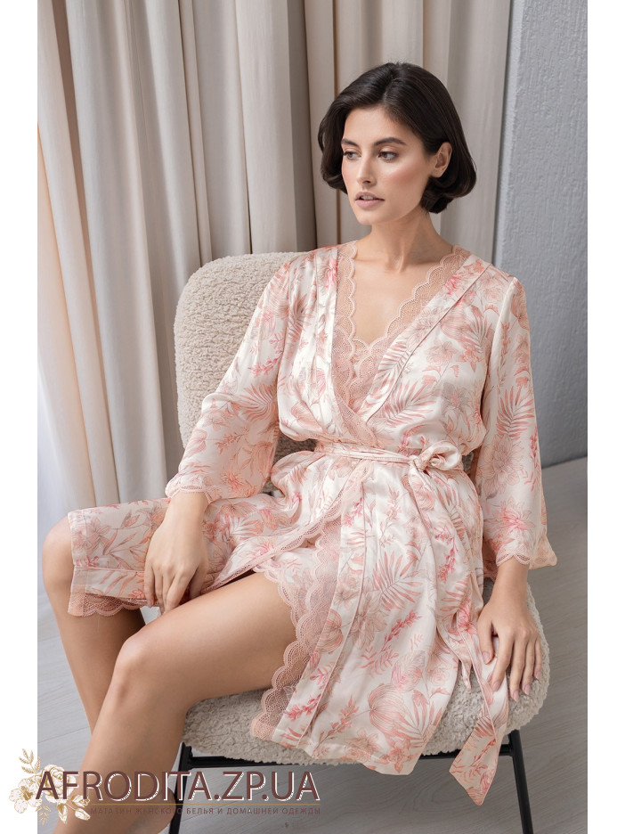 Короткий халат-кимоно на запах Молли 1923 от Mia-Amore с широким рукавом длиной 3/4. Изделие выполнено из принтованного смесового шелка . Ажурное кружево украшает борта и низ рукавов. По бокам обработаны карманы.