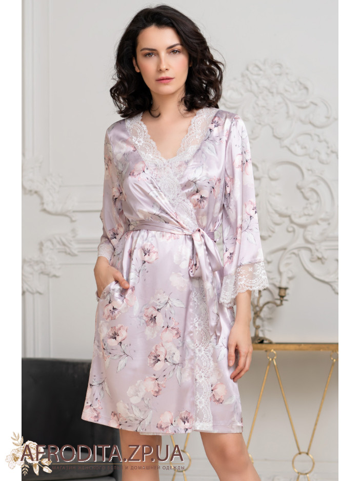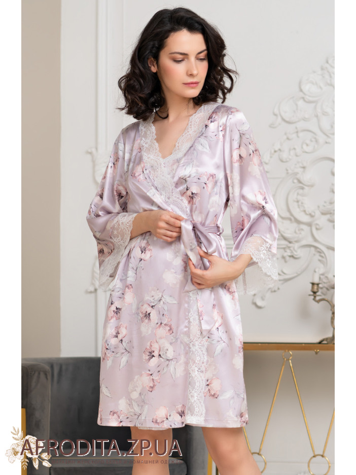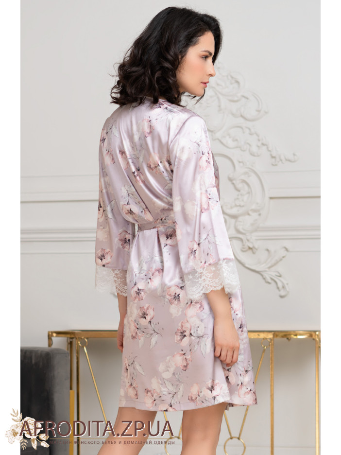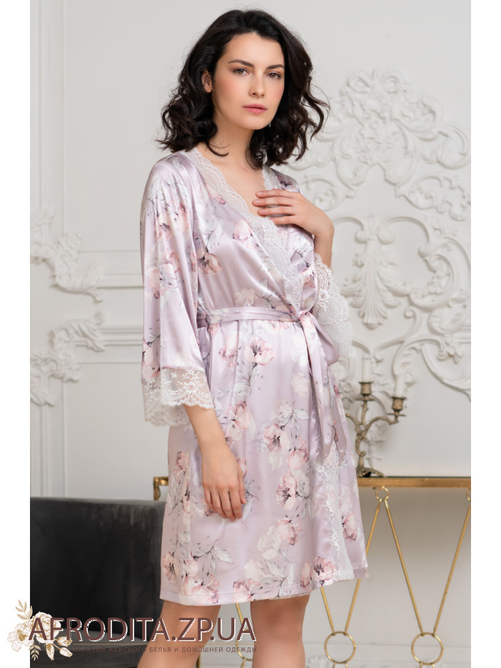 Короткий халат на запах Селин 3713 от Mia-Amore с широким длинным рукавом, выполнен из принтованного смесового шелка и декорирован ажурным кружевом, которое расположено по низу рукавов и вдоль бортов полочек. По бокам обработаны карманы.