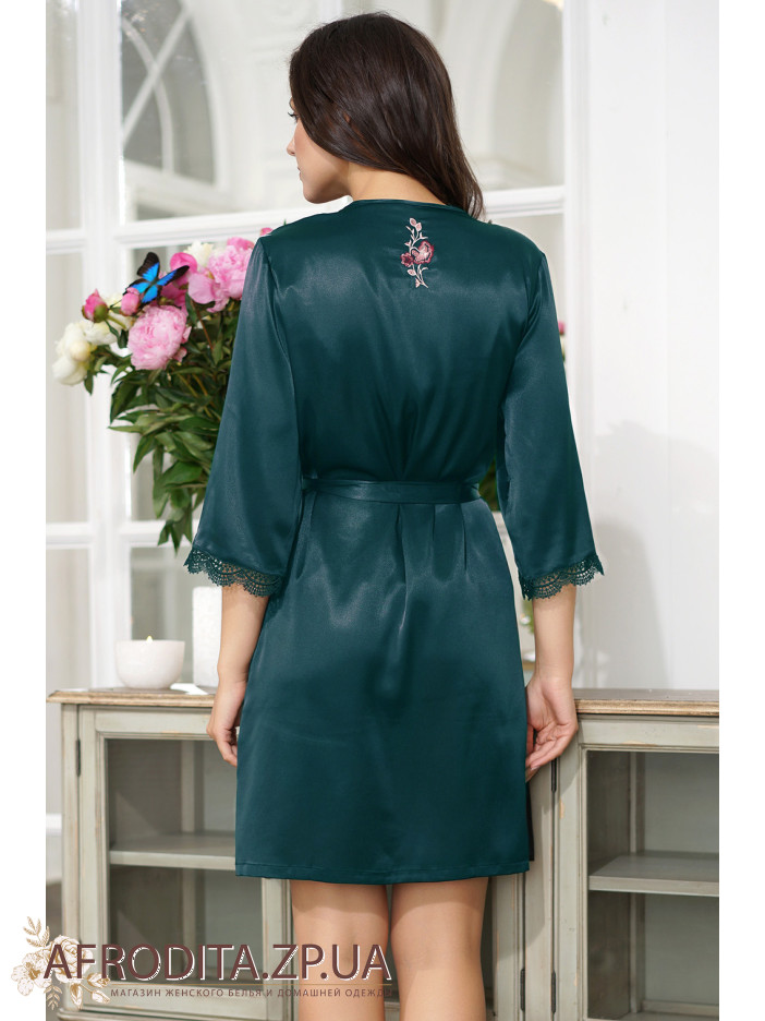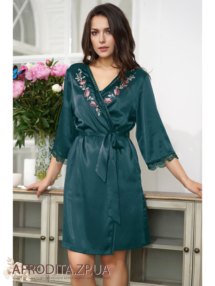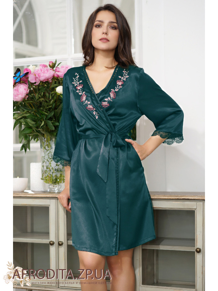 Короткий запашной халат Валенсия 3263-1 от Mia-Amore с рукавом ¾, украшенный традиционной для Европы цветочной вышивкой. Рукав декорирован ажурным кружевом, воротник — мережкой.