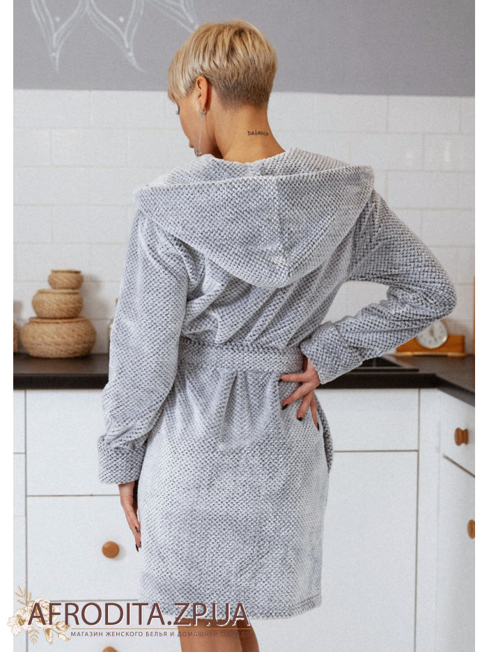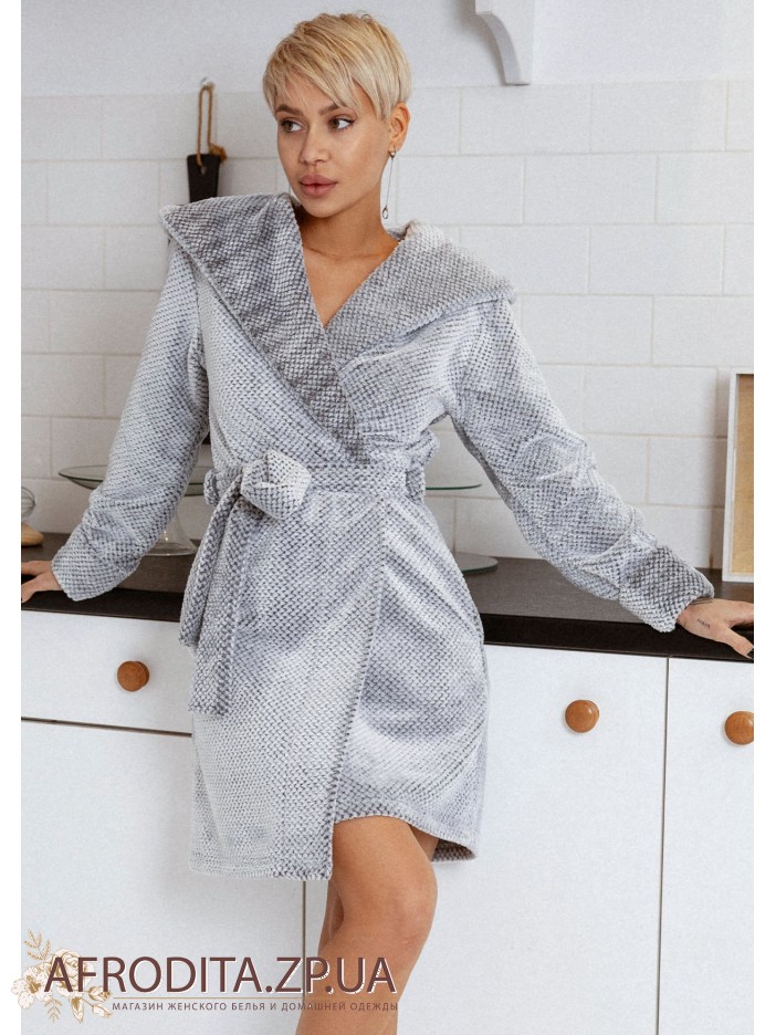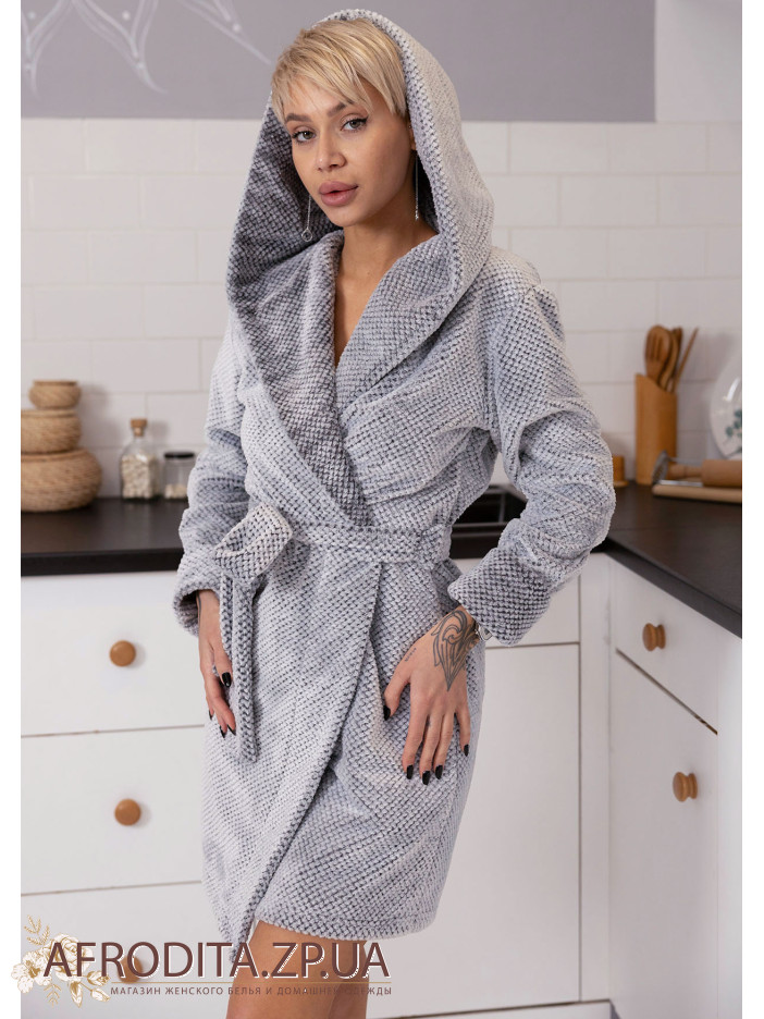 Женский теплый халат 1426-90053 изготовленный из текстурного мягкого флиса. Халат с длинным рукавом на запах. Длина выше колен. Стильный капющон придает неповторимую изюминку данному изделию. Линию талии можно регулировать с помощью пояса.