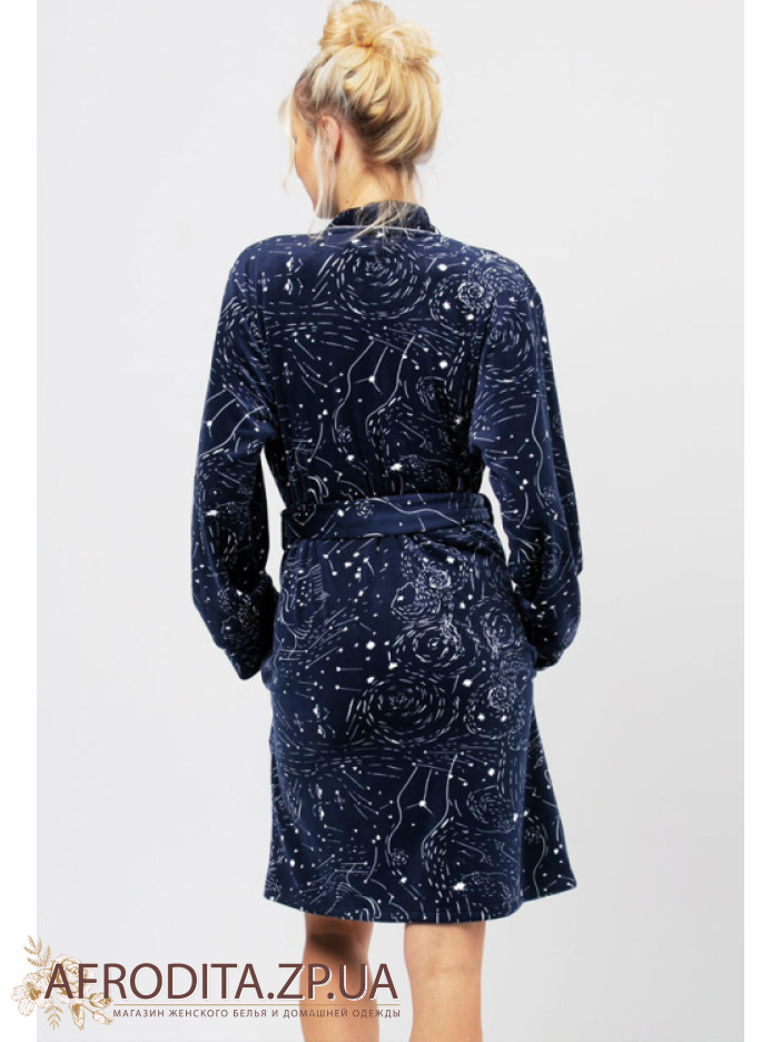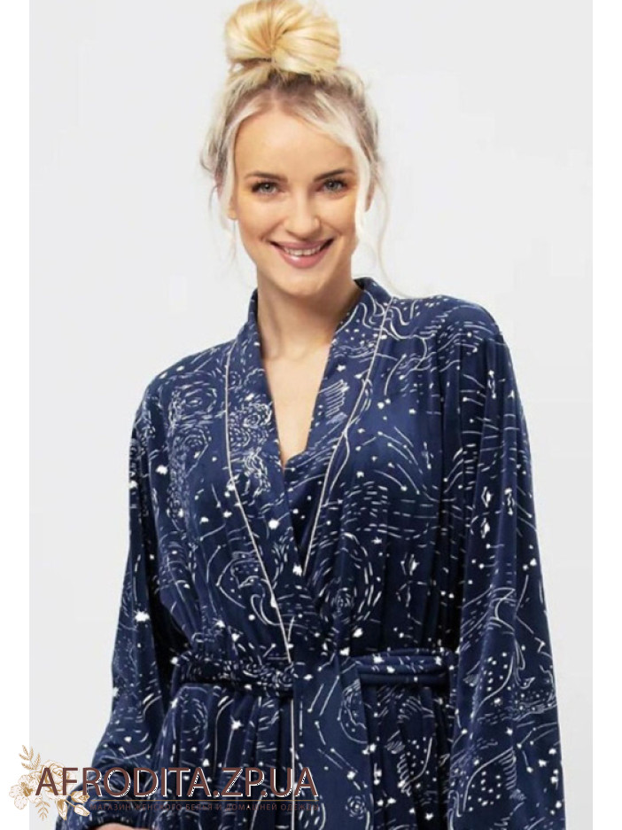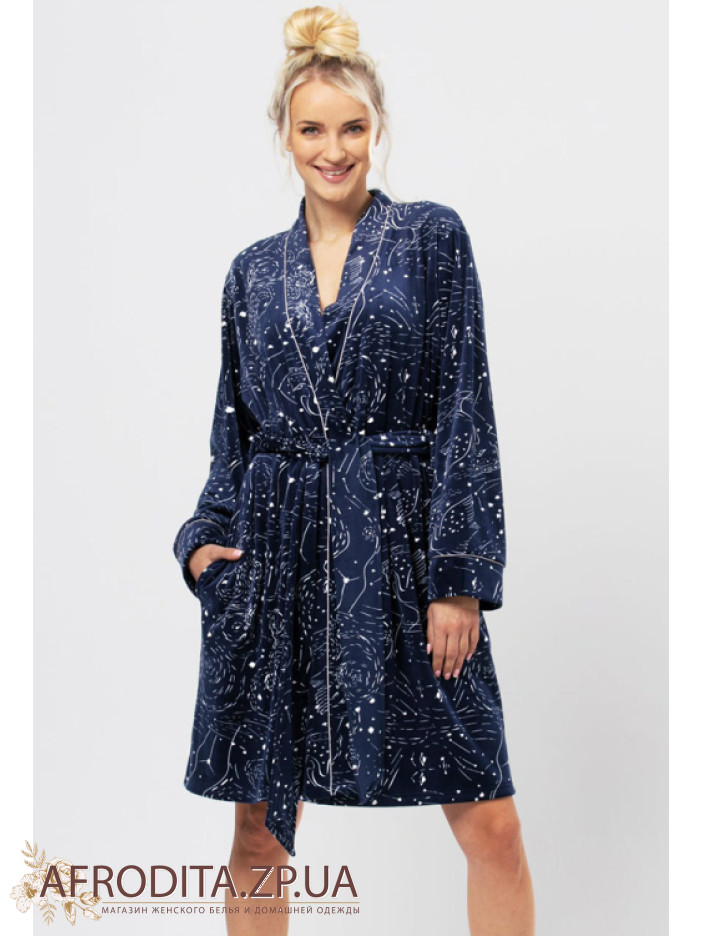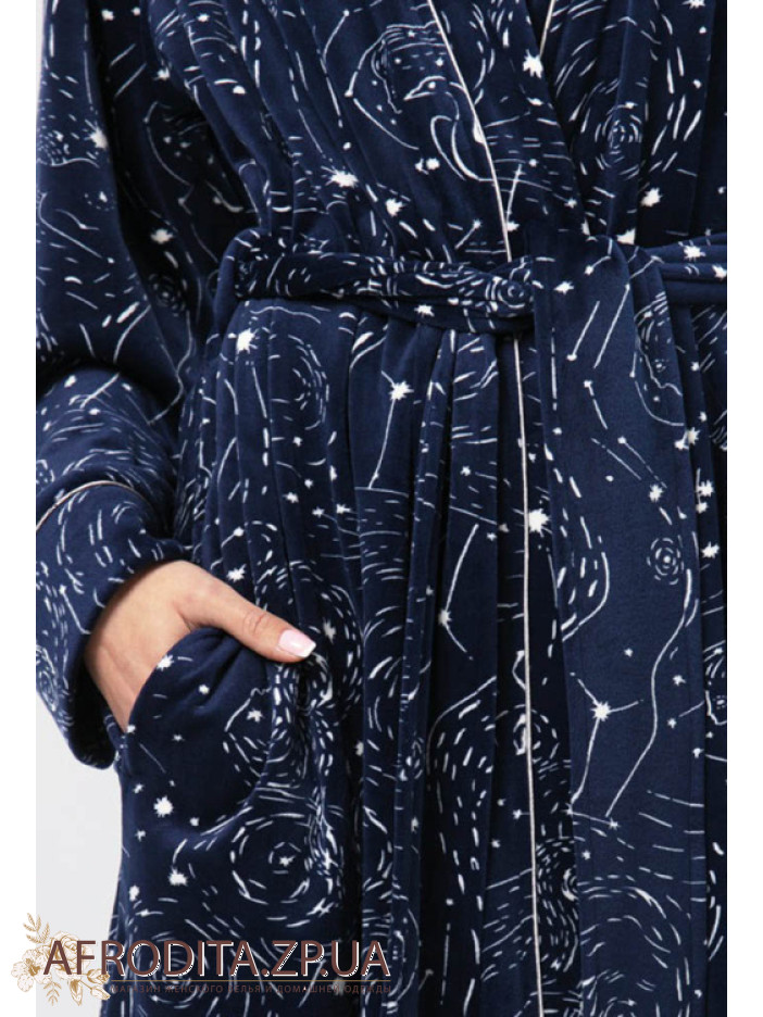 Женский теплый халат из мягкого и очень приятного к телу флиса. Модель на запах с длинной до колен, по бокам расположены карманы. Линию талии можно регулировать с помощью пояса.