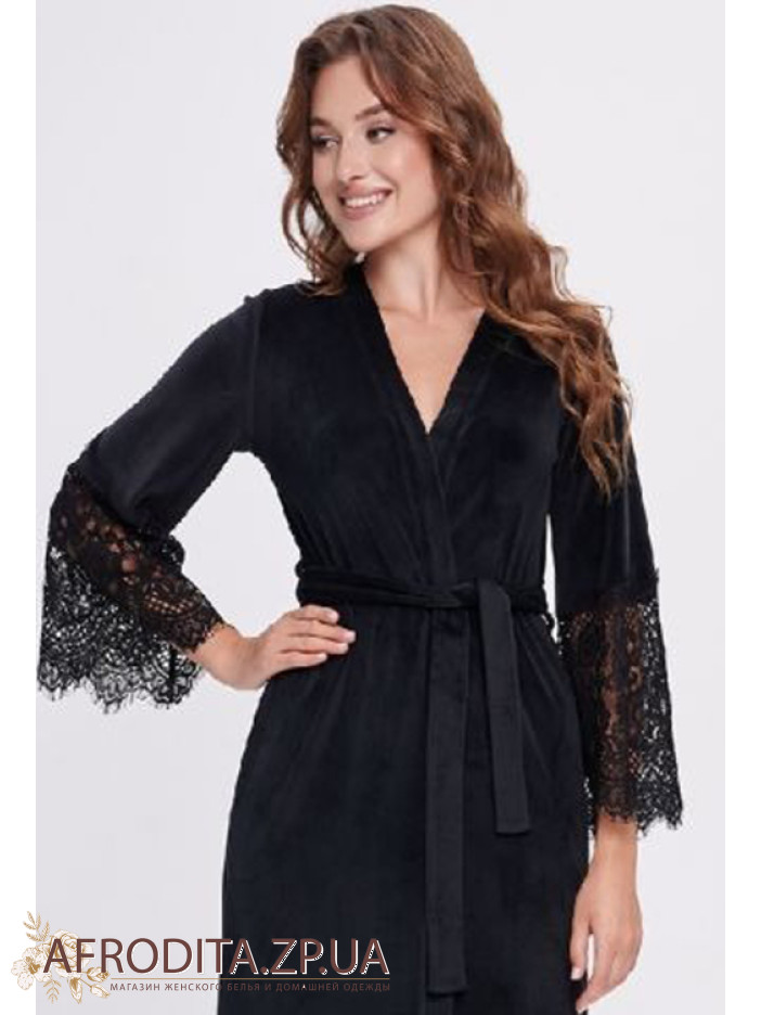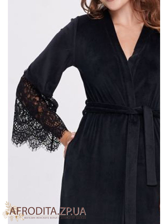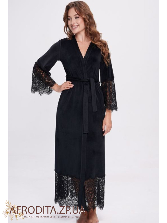 Элегантный длинный женский халат от украинского бренда Shato выполнен из мягкого качественного велюра чёрного цвета, имеет длину макси и длинные рукава, дополнен удобными боковыми карманами, завязывается на запах поясом и украшен эффектными широкими вставками из кружева с цветочным узором на рукавах и по низу, дарит комфорт дома и подчеркнёт женственность, становясь стильным подарком для любимого или близкого человека.