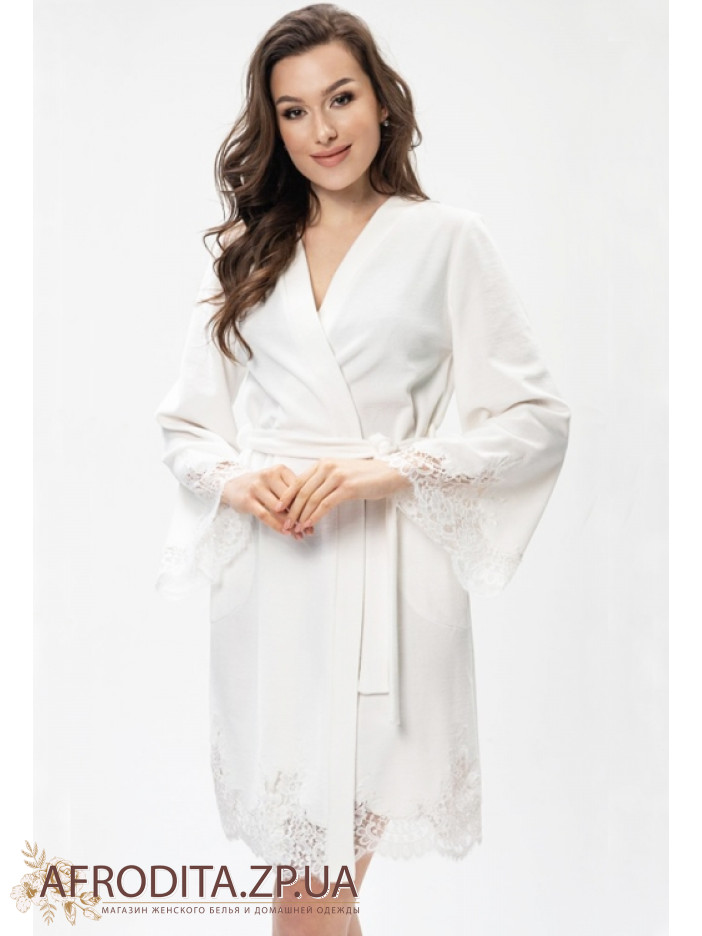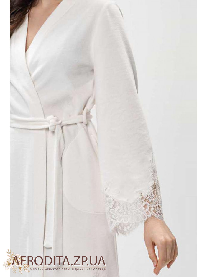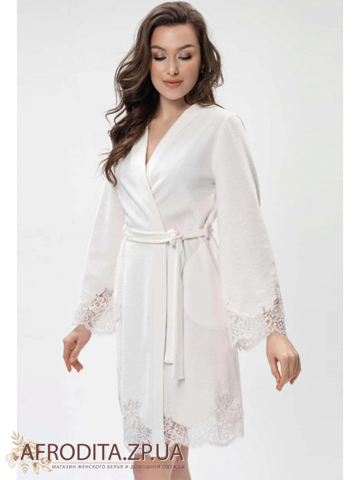Женский халат из велюра Shato 2430 изготовленный на хлопковой основе. Халат выше колен на запах, Края рукавов и нижняя честь изделия декорированы кружевом. В комплекте прилагается пояс.