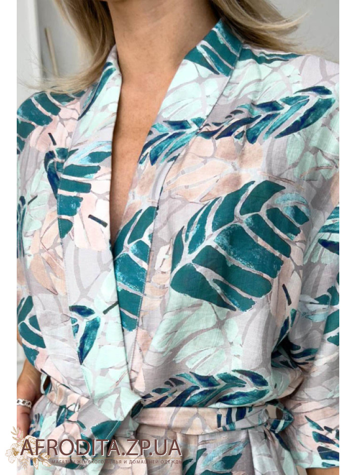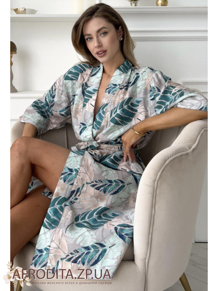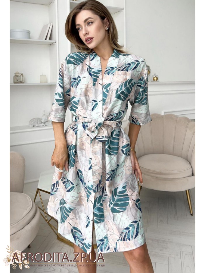 Женский домашний халат из мягкой и очень приятной к телу вискозы  от торговой марки Cosy с оригинальным принтом в виде листьев. Халат на запах длинной до колен. Длина рукава 3/4, в боковых швах изделия расположены карманы. В комплекте прилагается пояс с помощью которого можно регулировать линию талии. В этом халате вы будете чувствовать себя очень комфортно. Данная модель может послужить отличным подарком близкому человеку.