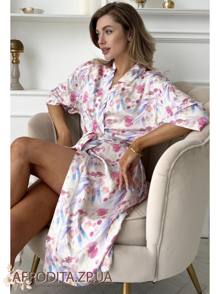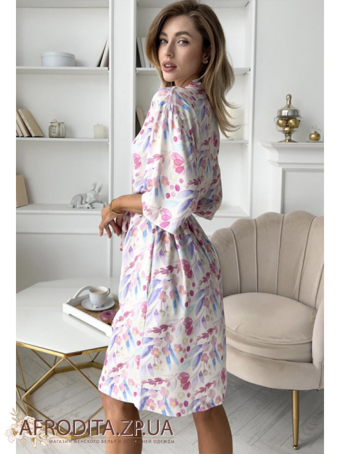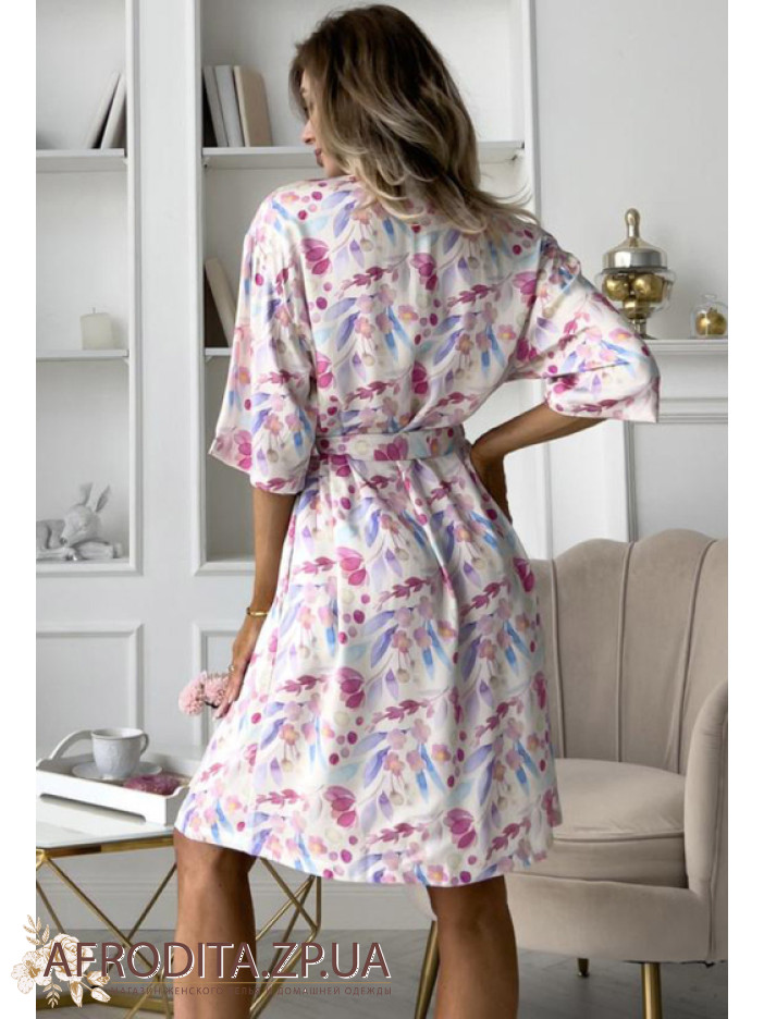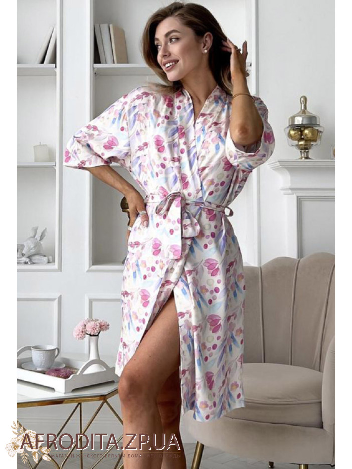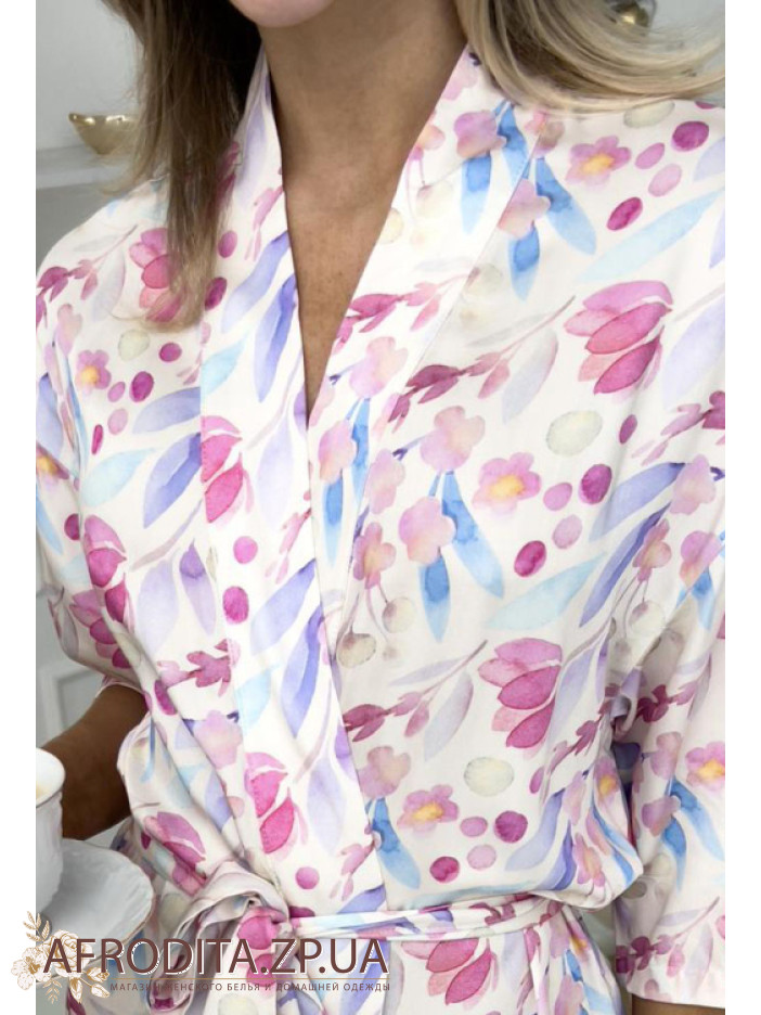 Женский домашний халат из мягкой и очень приятной к телу вискозы от украинского бренда Cosy. Халат на запах с рукавами 3/4, в комплекте прилагается пояс, с помощью которого можно регулировать линию талии. По бокам халата расположены карманы. Неповторимый и оригинальный цветочный принт придает изюминку данному изделию. Халатик очень комфортный и приятный на ощупь и может послужить отличным подарком близкому человеку.