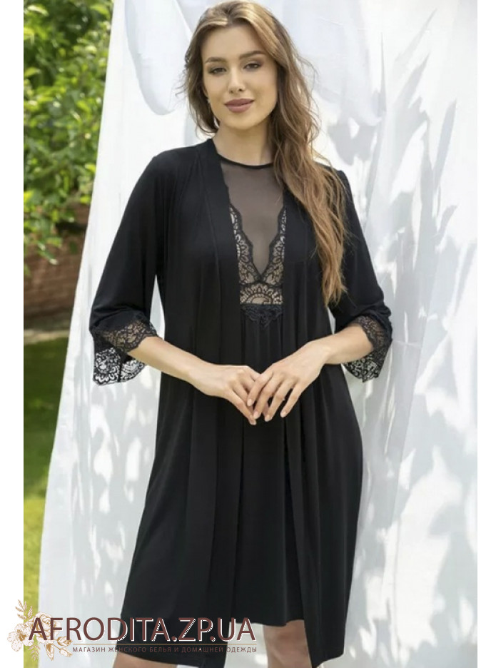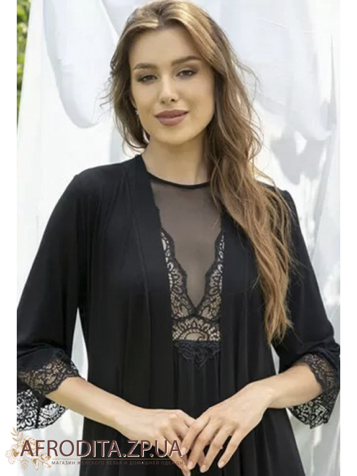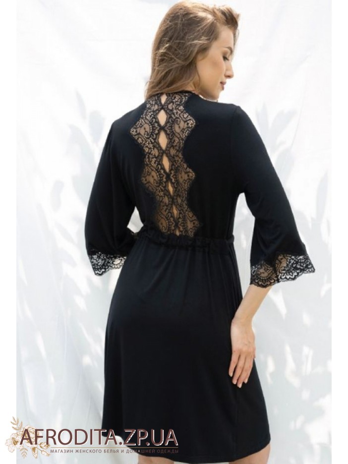 Женский халат из вискозы Shato 2315/1. Халат на запах до колен, длинна рукава 3/4 края декорированы кружевом. Спинка изделия также имеет кружевные вставки, что придает модели неповторимый шарм. Линия талии регулируется поясом.