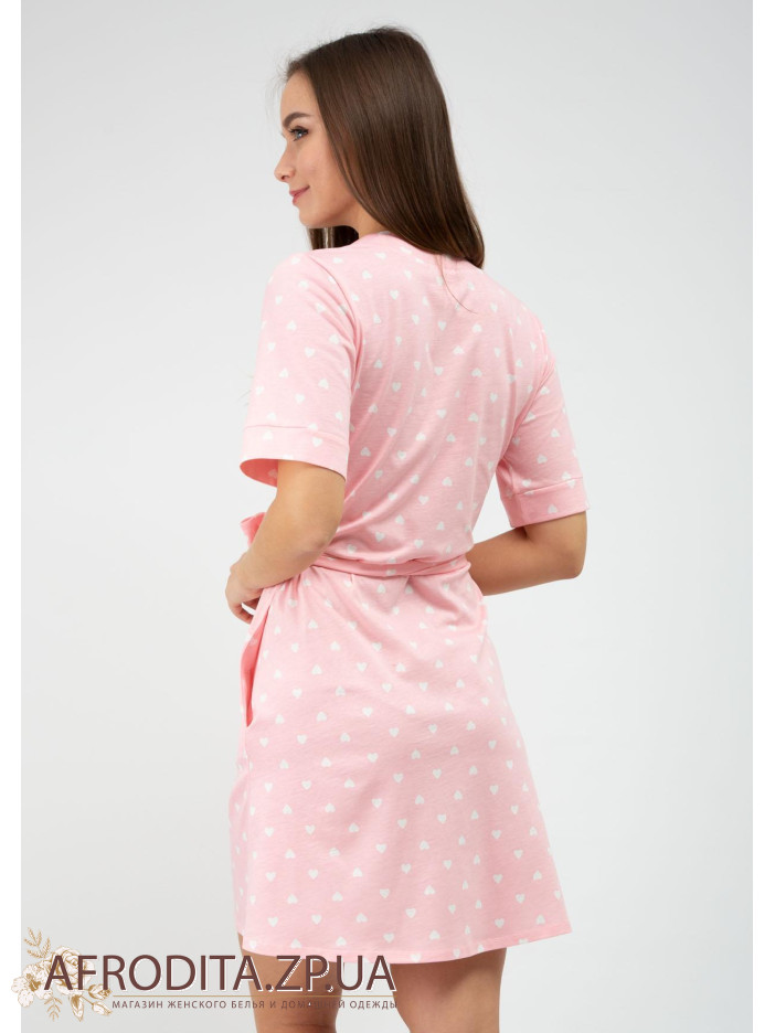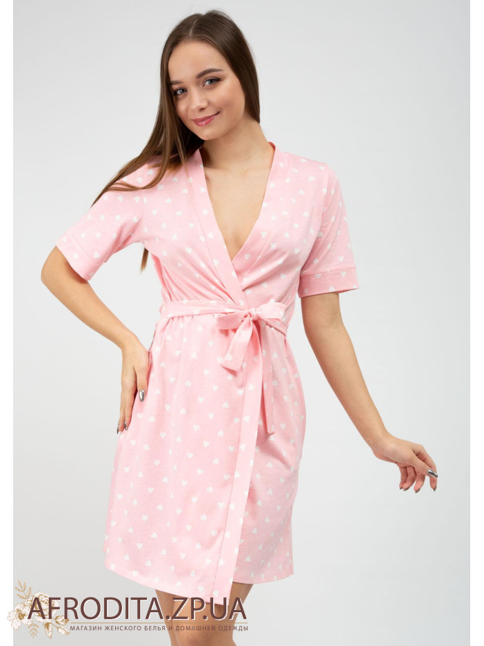 Женский халат на запах 1159-12528 изготовленный из хлопка. Халат до колен с коротким рукавом, линия талии регулируется поясом.