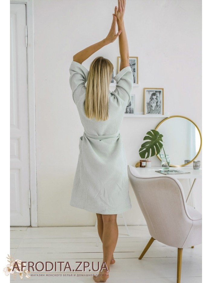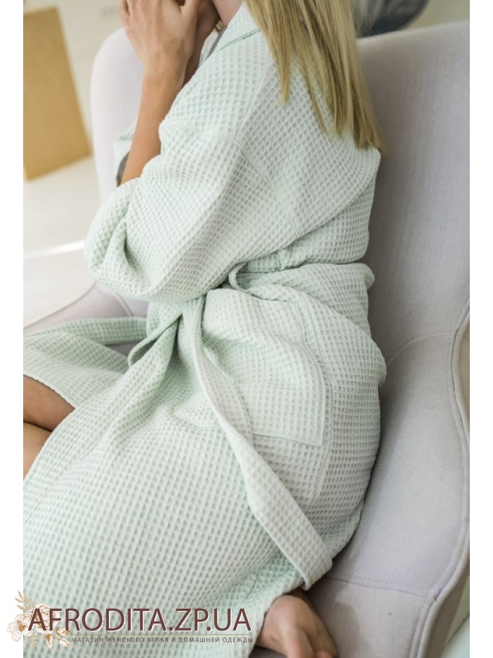 Женский халат изготовленный из фактурного хлопка от украинской торговой марки Cosy. Халат мятного цвета на запах, длинна чуть выше колен, длинна рукава 3/4. В комплекте прилагается пояс с помощью которого можно регулировать линию талии. Спереди по обеим бокам расположены карманы. Халат очень практичный и приятный к телу, хорошо подходит как для сауны так и для домашнего пользования. Данная модель может служить хорошим подарком близкому человеку.