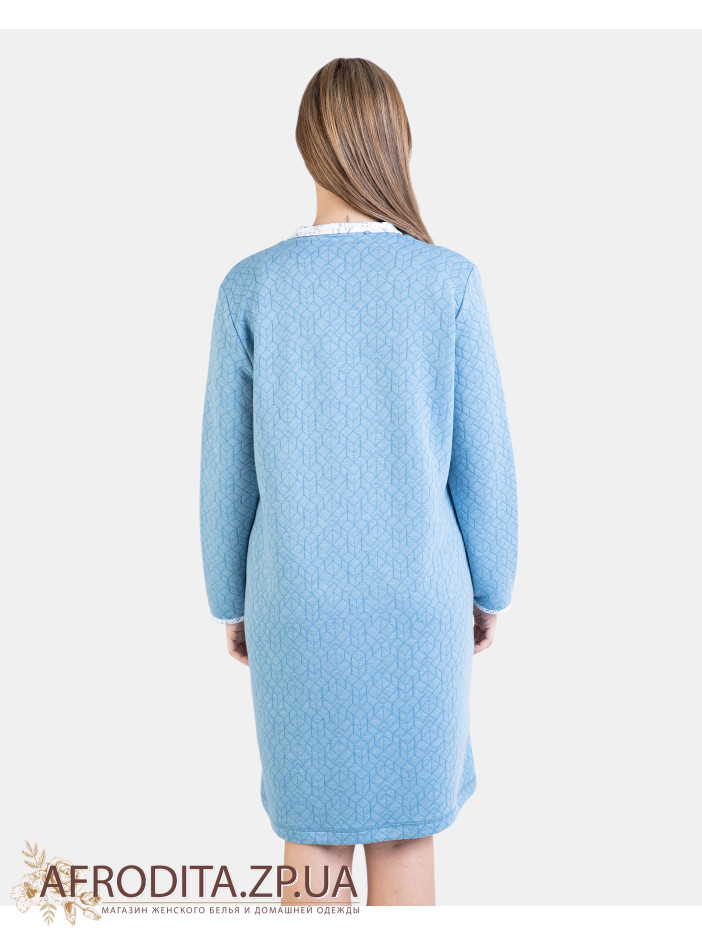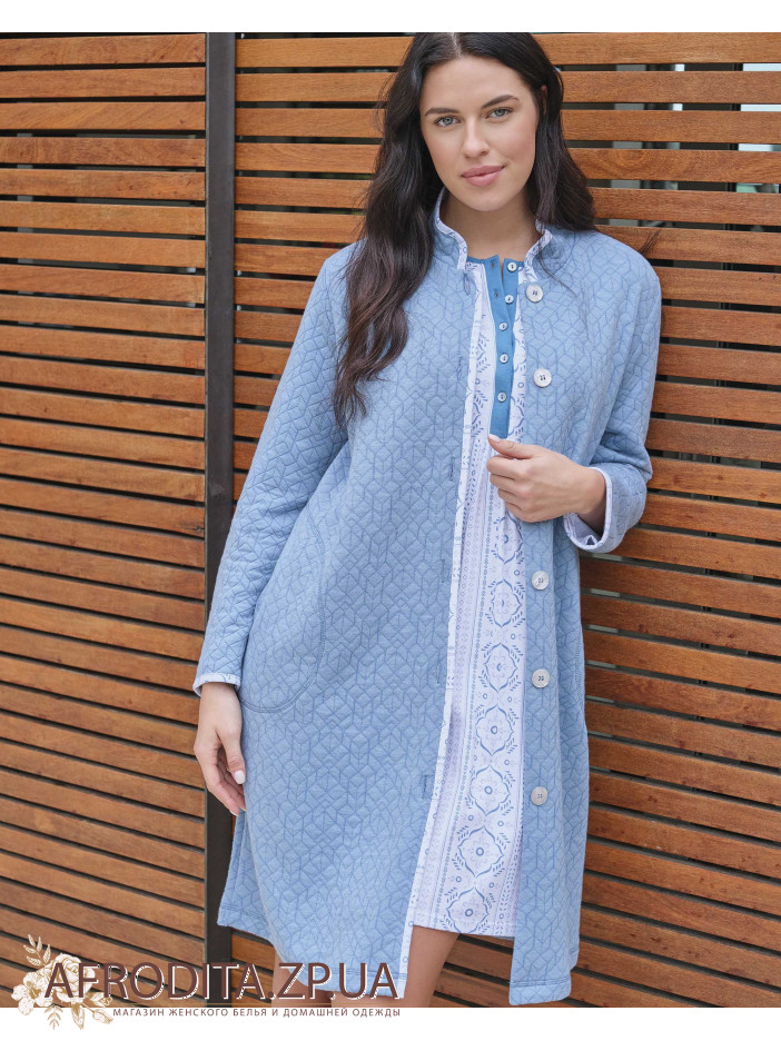 Женский халат на пуговицах Massana L736280 производство Испания. Халат до колен, воротник рубашечного типа. Борт изделия и края рукавов декорированы белым кантом. По бокам расположены карманы.