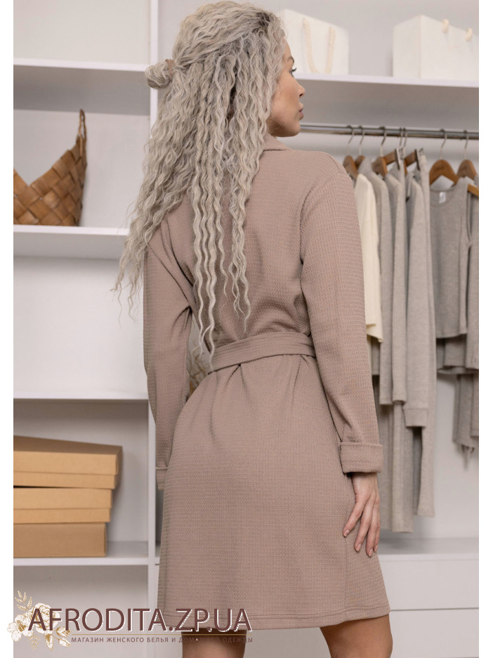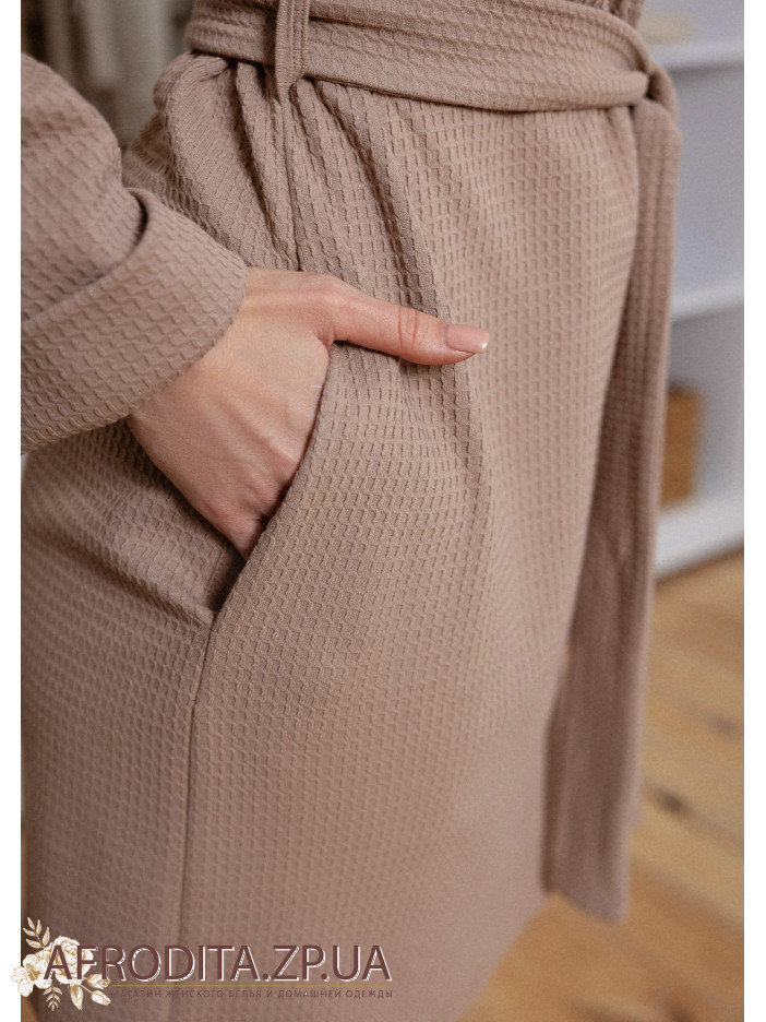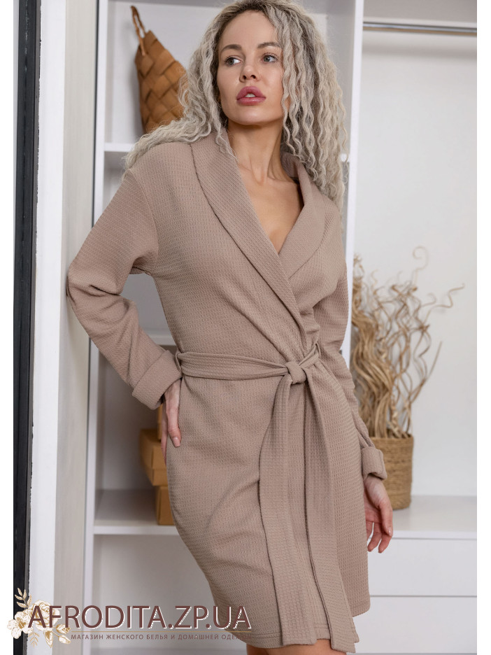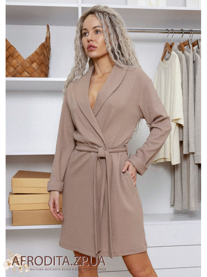 Женский халат на запах 1420-75004 изготовленный из фактурного хлопка. Халат нежно кофейного цвета средней длины. Линия талии регулируется поясом, по бокам расположены карманы.