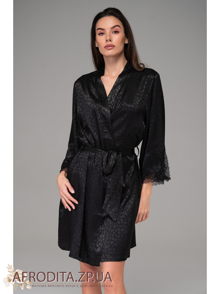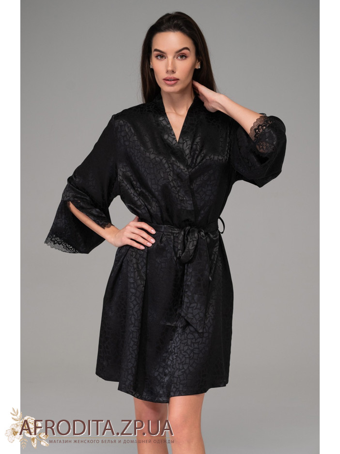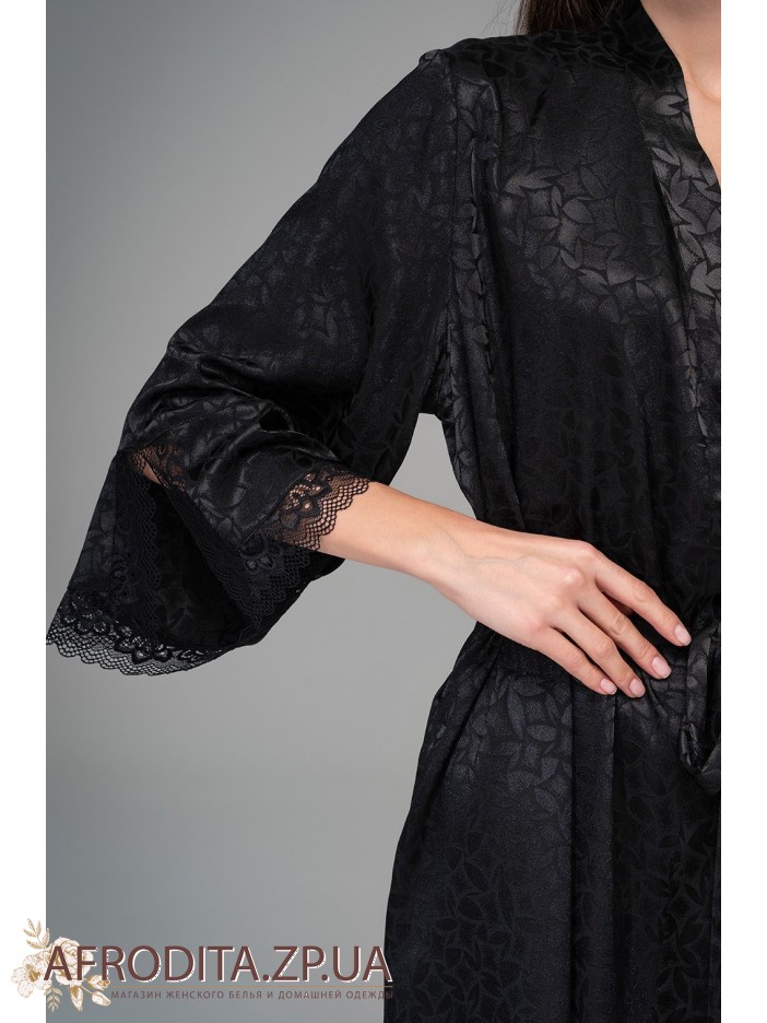 Женский халат Джоанна 7313-1 от Mia-Amore изготовленный из искусственного жаккардового шелка с широкими рукавами длинной 3/4, края которых украшены кружевом в цвет изделия. Модель на запах и длинной выше колен. С помощью пояса можно регулировать линию талии. По бокам расположены карманы.