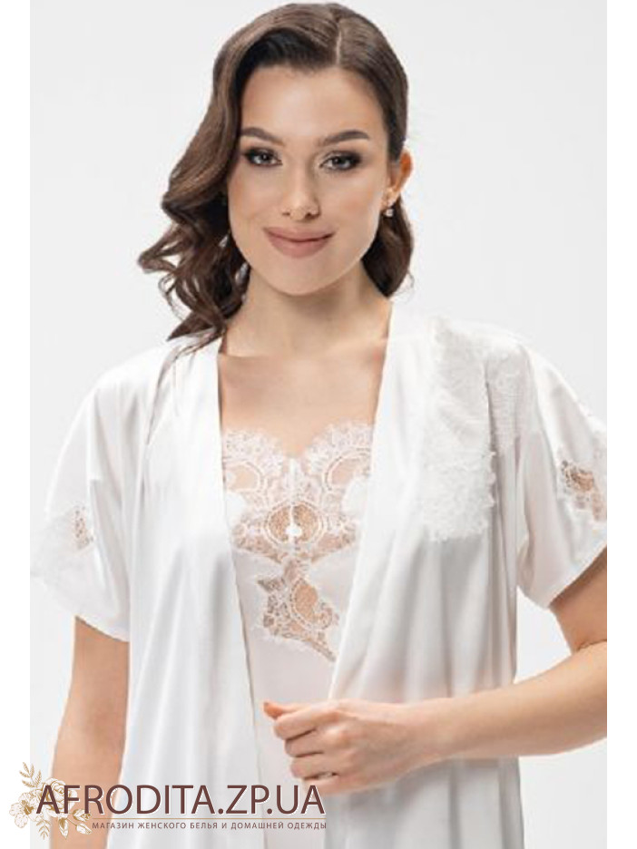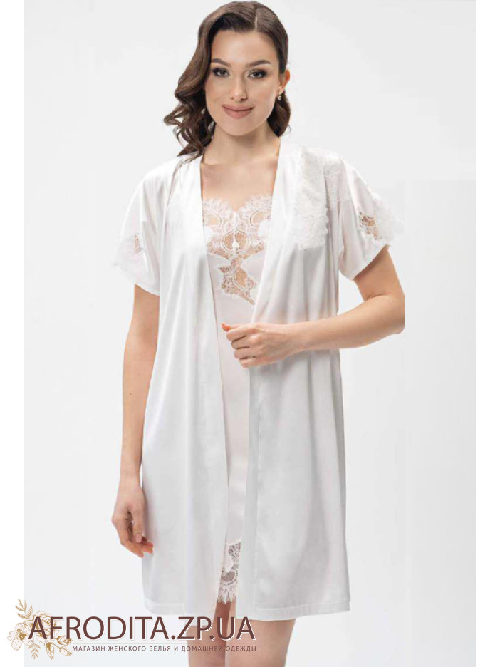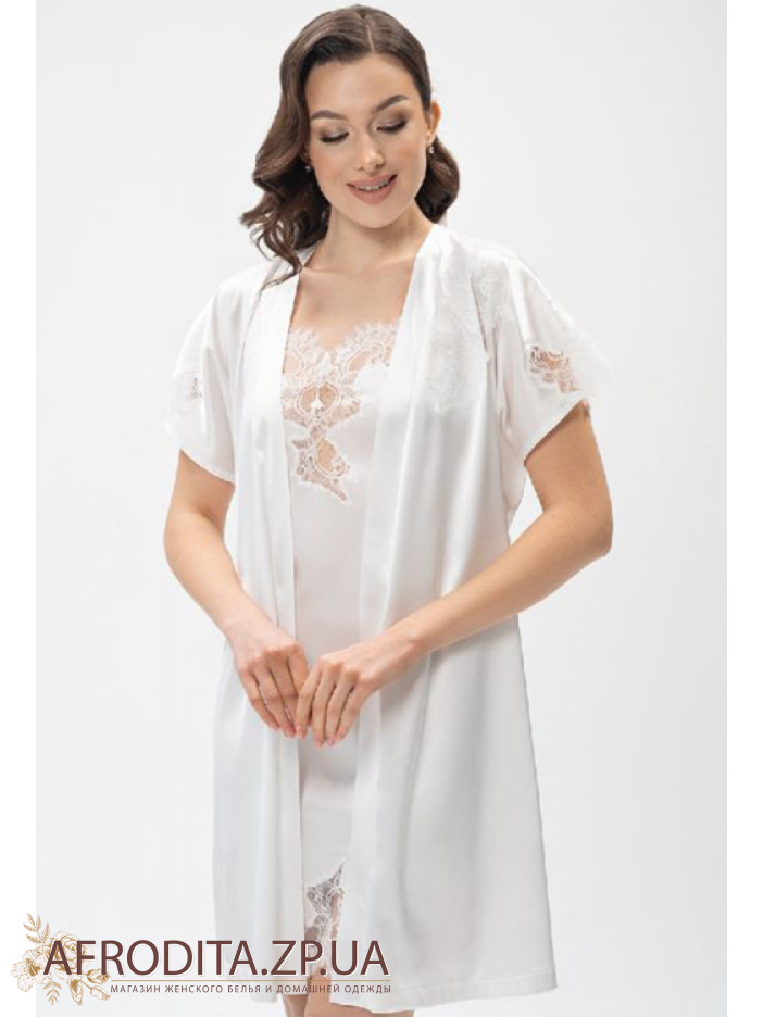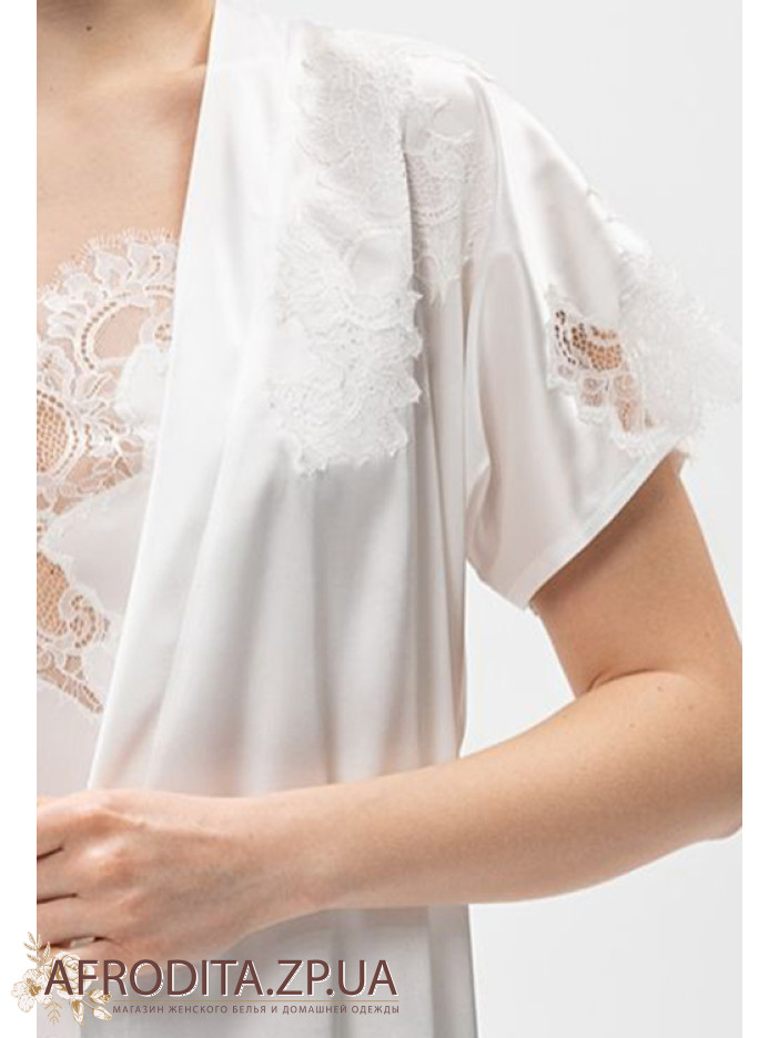 Женский халат на запах Shato 2401/1 из атласного шелка. Халат с короткими рукавами длинной выше колен. Рукава украшены кружевными вставками.