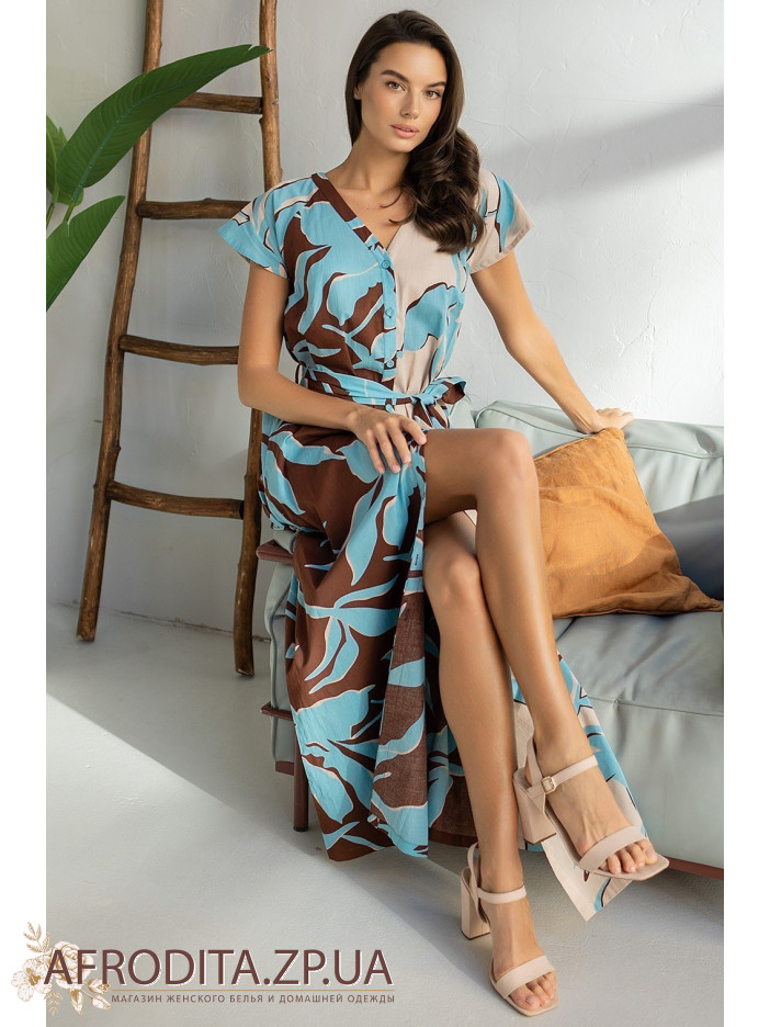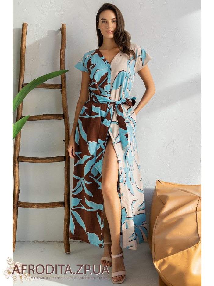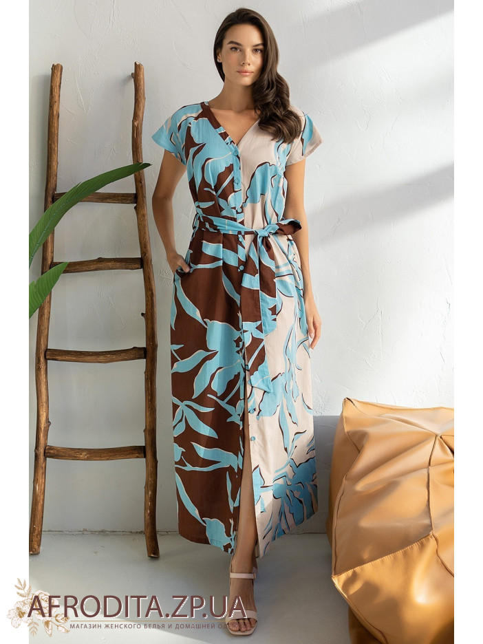 Удлиненное платье-рубашка Шерил 2009 от Mia-Amore с центральной застежкой на пуговицы и коротким рукавом. Изделие выполнено из двух видов принтованного хлопка. По бокам расположены карманы. Линию талии можно подчеркнуть за счет пояса, который идет в комплекте.
