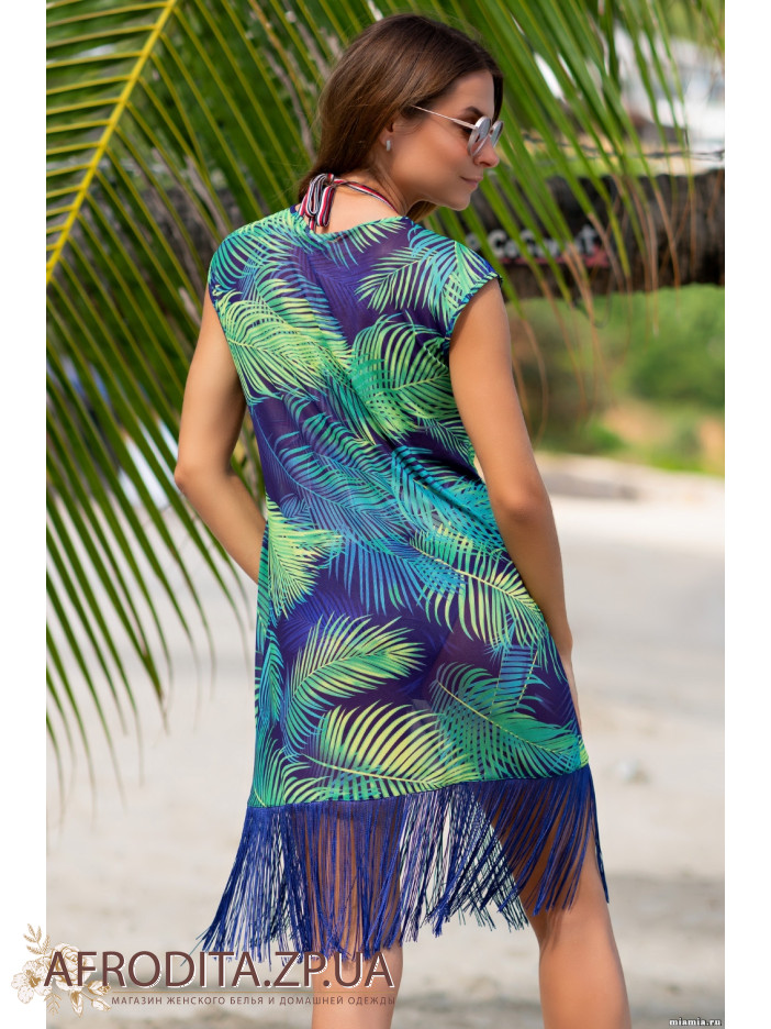 Короткая туника Ипанема 8830 Mia-Amore без рукавов полуприлегающего силуэта выполнена из тонкой гигроскопичной мягкой принтованной сетки. Сетка принтована ярким рисунком в виде пальмовых листьев разных оттенков - от салатового до глубокого изумрудного. Низ туники эффектно заканчивается синей шелковистой летящей бахромой, которая слегка закрывает колени. Завязки горловины декорированы павлиньим перышком на конце.Состав 100% полиэстер