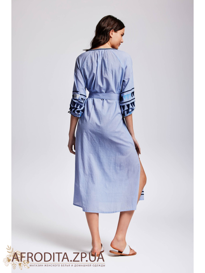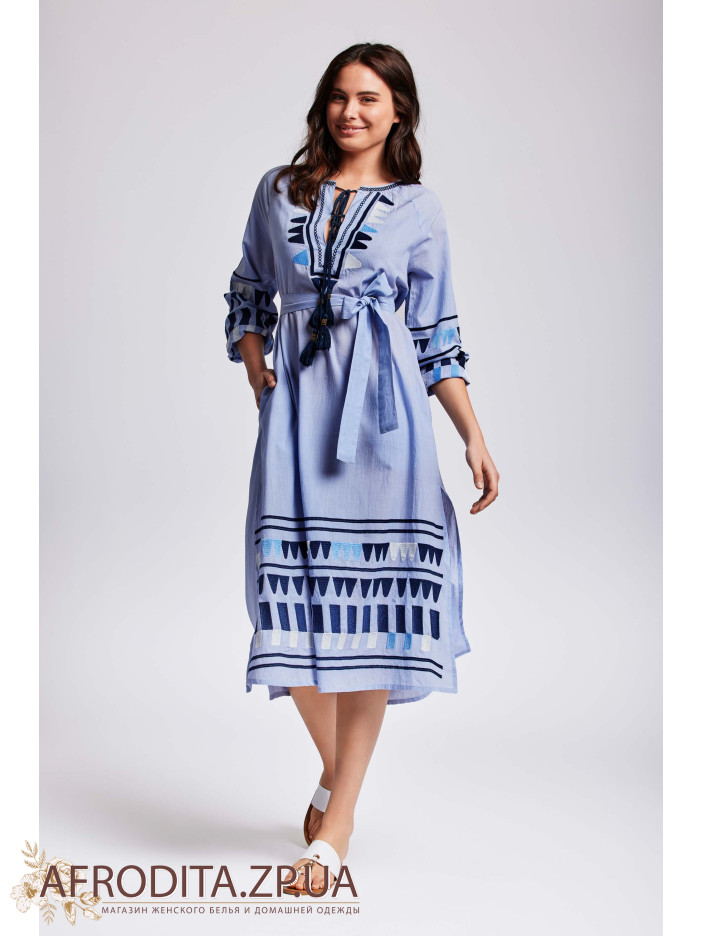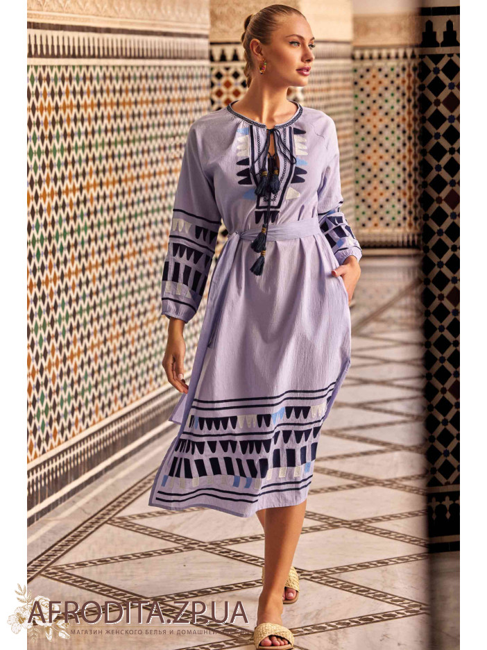 Длинное летнее платье Iconique IC24-044 изготовленное из высококачественного хлопка. Длинный рукав, горловина имеет округлую форму с завязками с кисточками. Линия талии регулируется поясом. По бокам расположены карманы.