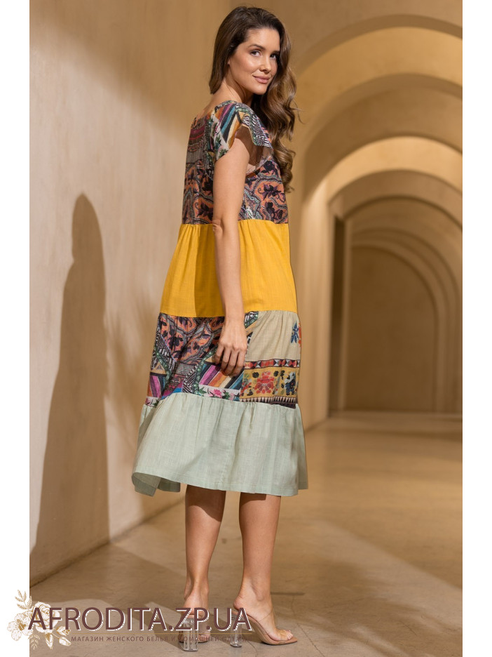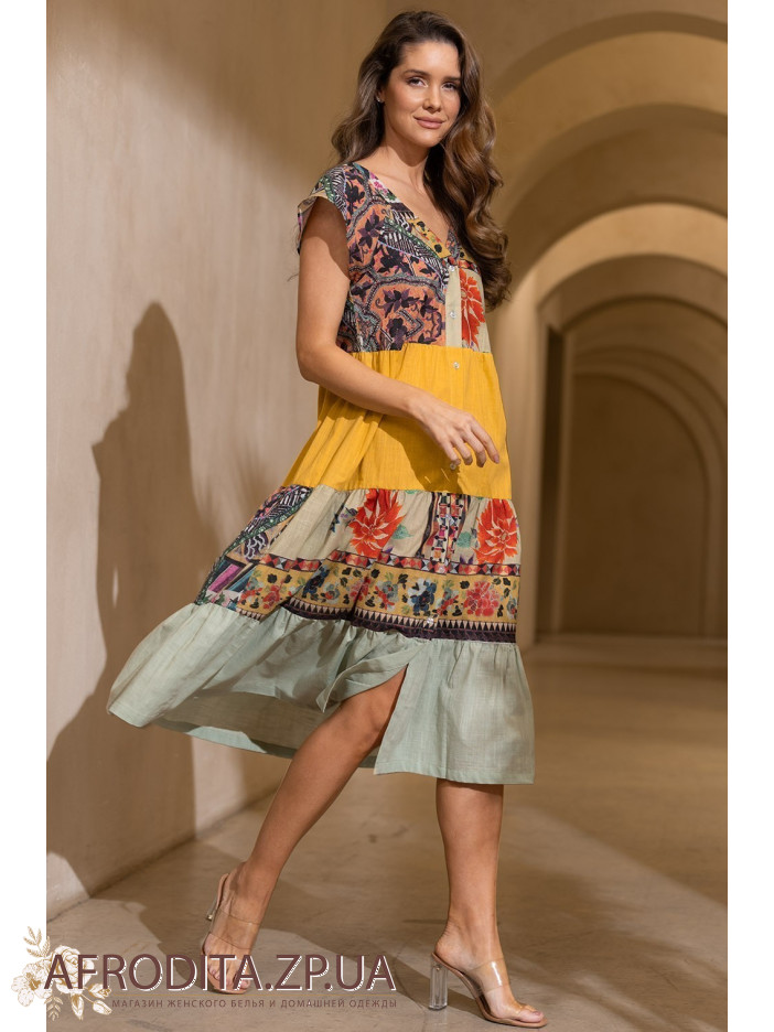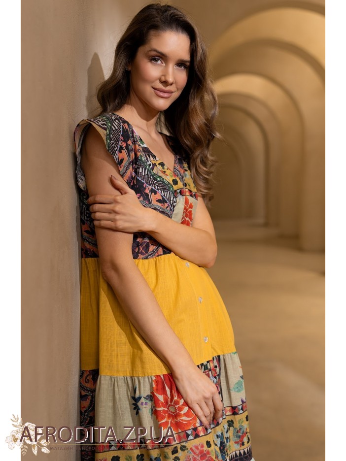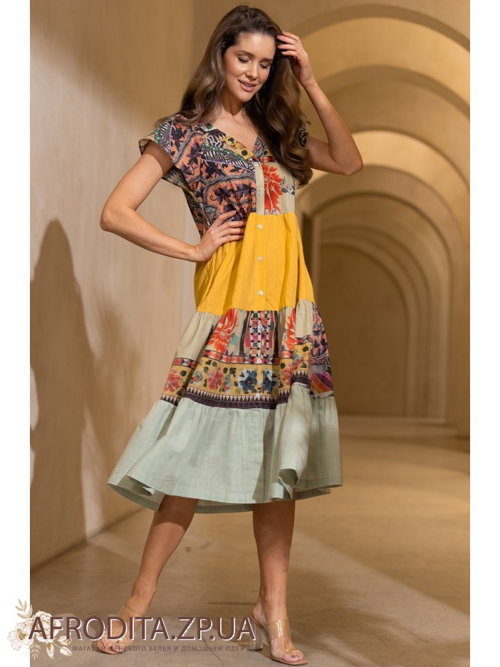 Длинное платье Камбоджа 5278 от Mia-Amore с коротким рукавом и оборкой по низу. Изделие выполнено из хлопка со льном. По центру застежка. В изделии применена комбинация принтованной ткани и однотонных компаньонов.