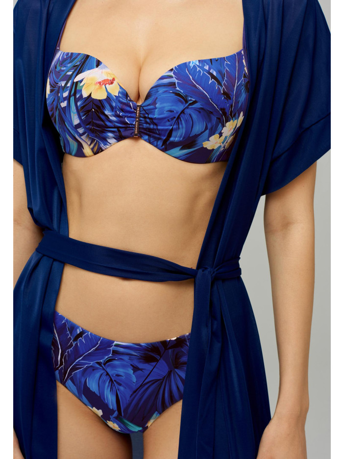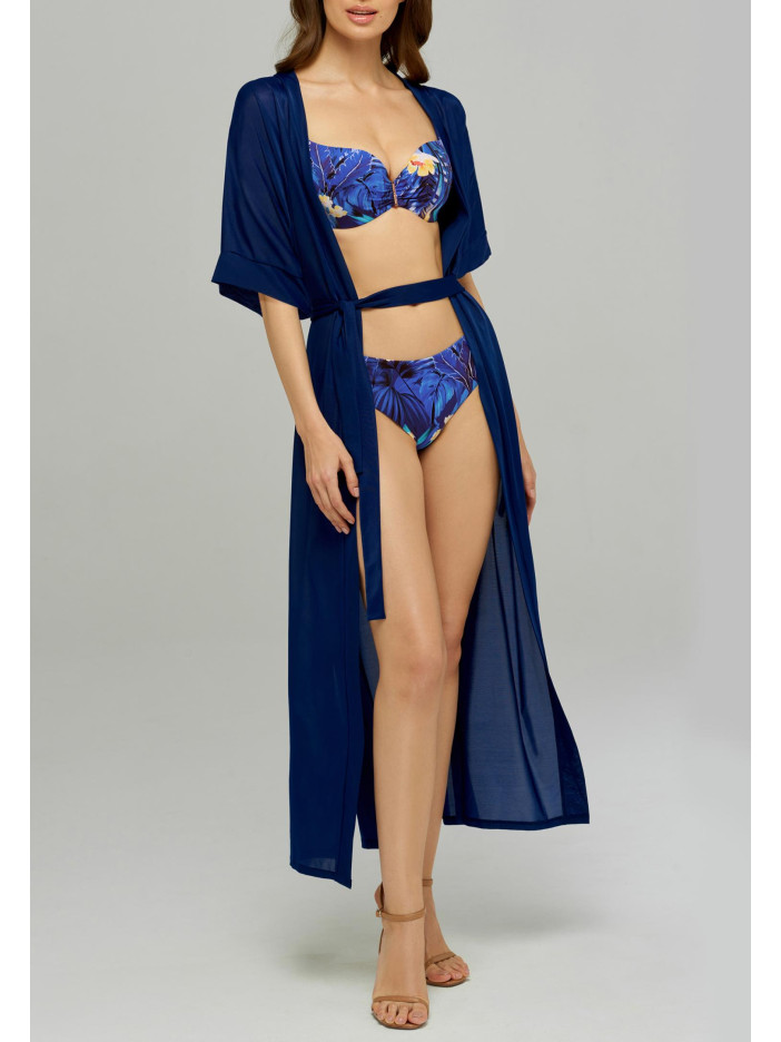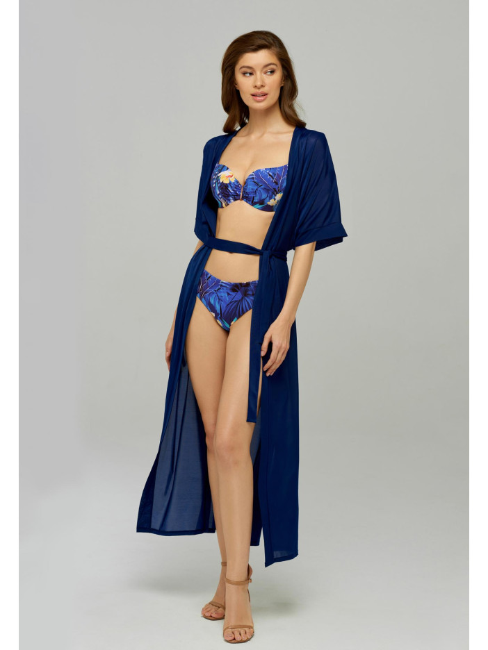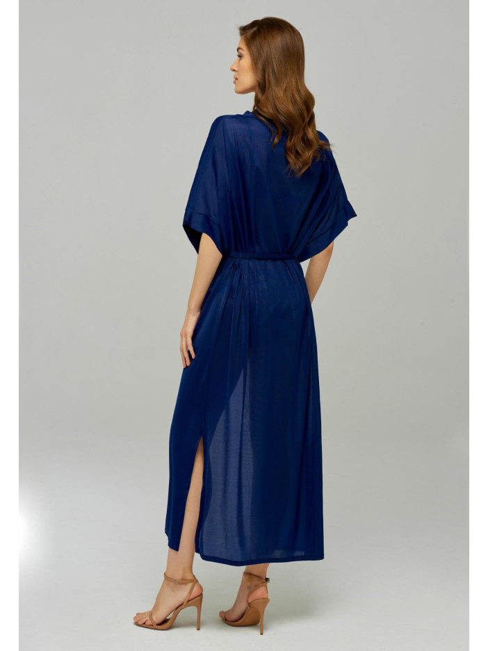Летняя туника макси с коротким рукавом — элегантная и универсальная модель для отдыха, выполнена из лёгкой полупрозрачной эластичной ткани, которая красиво струится по фигуре и обеспечивает комфорт в жаркую погоду, боковые разрезы добавляют свободу движений и лёгкость образу, съёмный пояс на завязках подчёркивает талию и позволяет варьировать силуэт, глубокий тёмно-синий цвет придаёт образу благородство, выразительность и стильную сдержанность