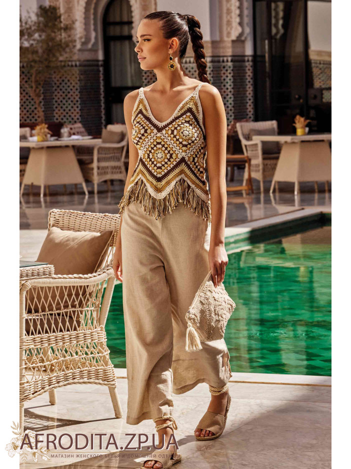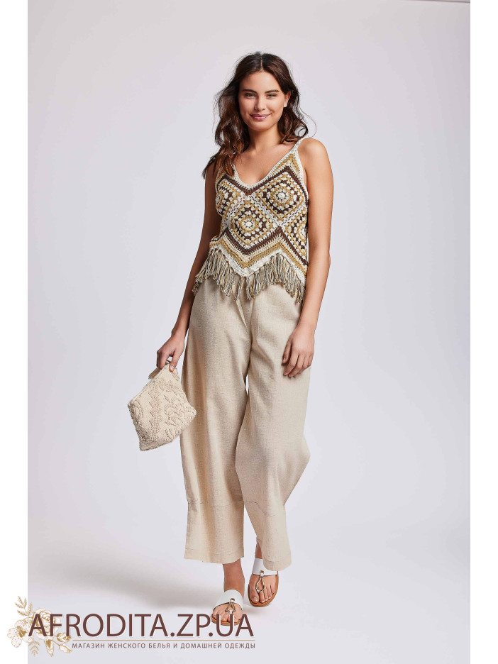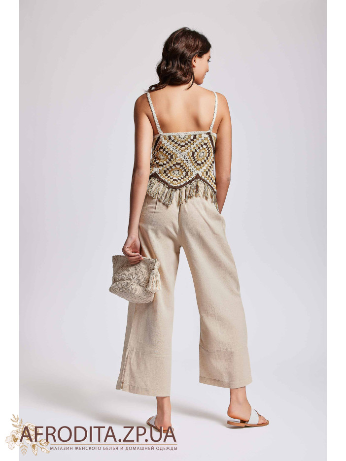 Комплект майка со штанами IC24-030/IC24-031. Комплект состоит из майки на тонких бретелях ручной вышивки крючком из хлопка, низ майки декорирован бахромой. Штаны свободного кроя из вискозы.