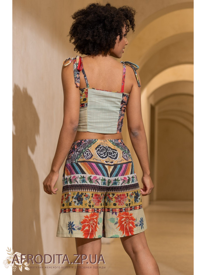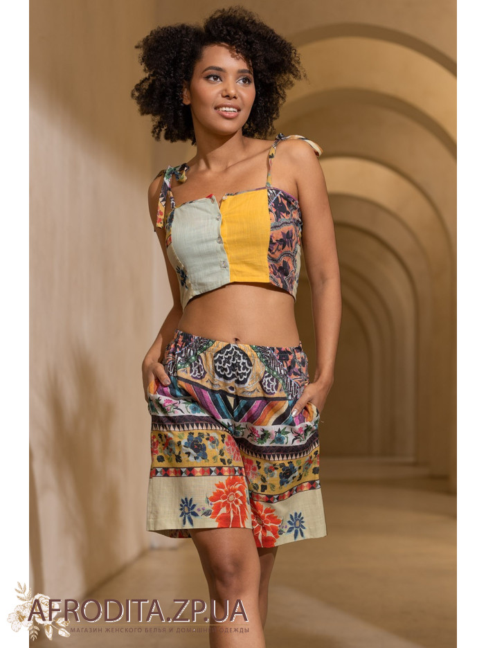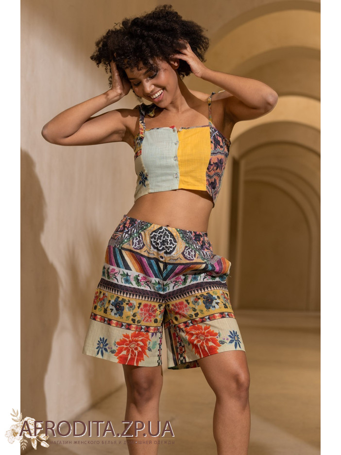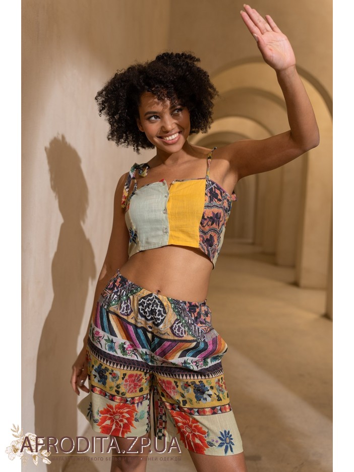 Комплект Камбоджа 5272 от Mia-Amore состоит из кроп-топа на бретелях и с застежкой по центру и удлиненных шорт. Полочка и спинка топа выполнена из двух видов однотонного компаньона, по бокам топа расположены вставки принтованной ткани. Шорты выполнены из принтованной ткани. Шорты с широким эластичным поясом. По бокам шорт расположены карманы.