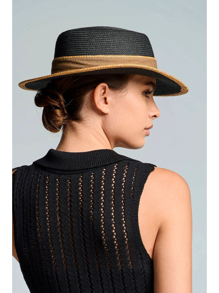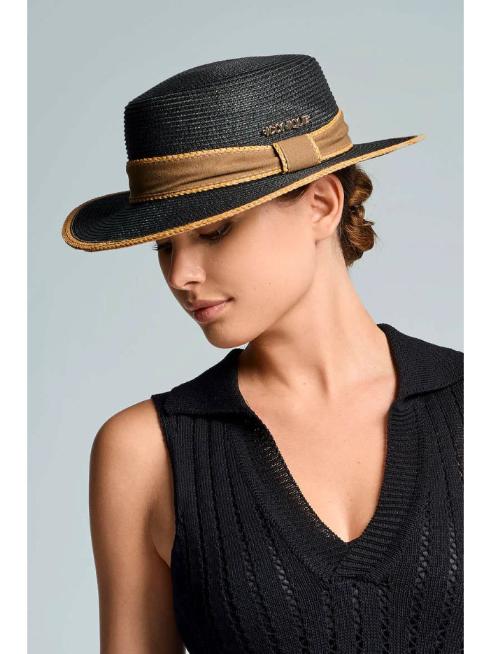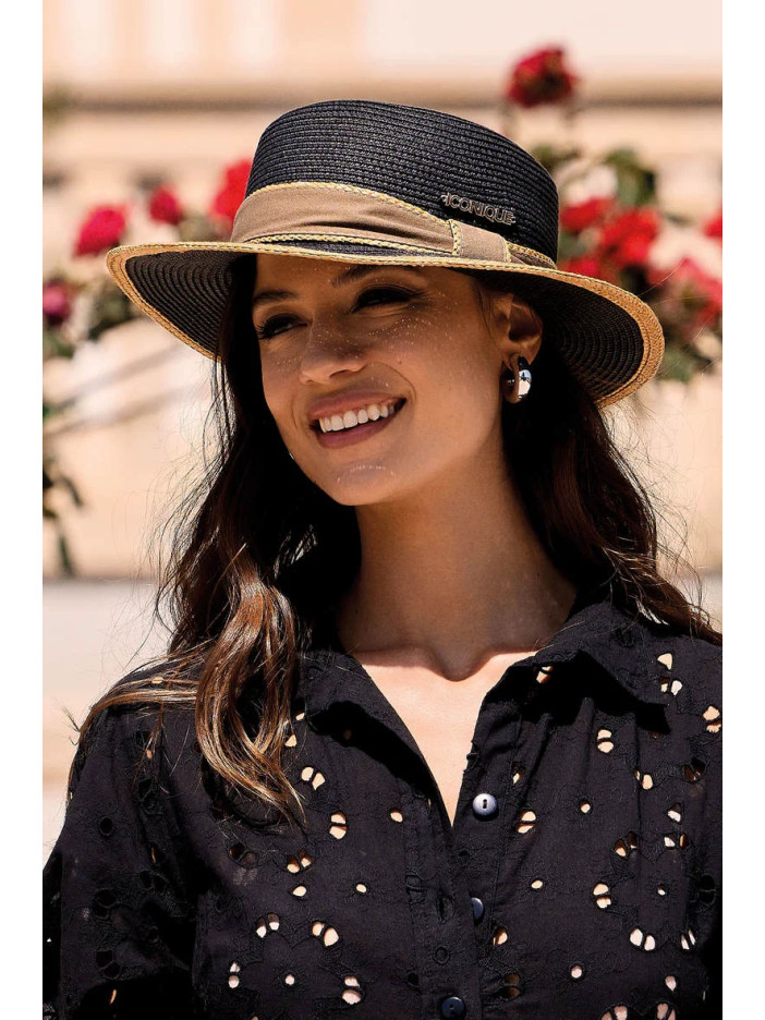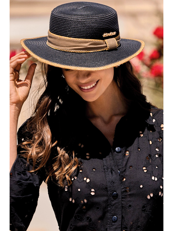 Стильная соломенная шляпа в чёрном цвете — эффектный акцент летнего образа, изящная фактурная плетёнка придаёт глубину и благородный вид, контрастная бежевая лента с декоративным элементом подчёркивает форму и добавляет элегантности, широкие поля с аккуратной окантовкой создают выразительный силуэт и надёжно защищают от солнца, идеально дополняет как пляжные, так и городские летние образы