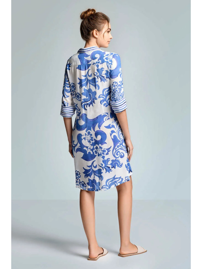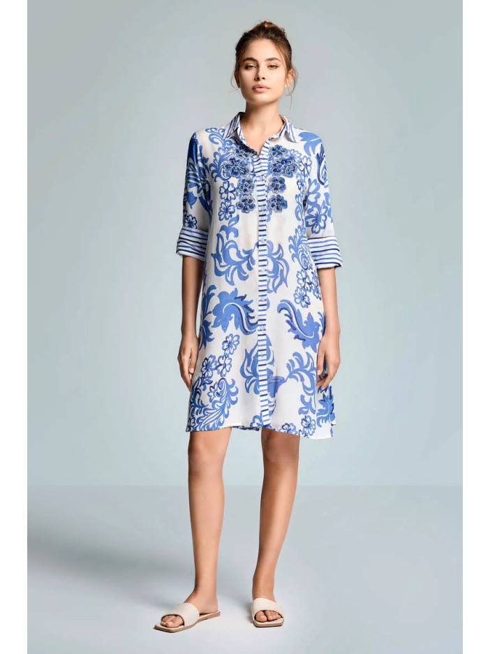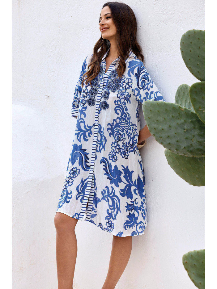 Пляжное платье-рубашка итальянского бренда — стильная и универсальная модель для летнего отдыха, выполнена из лёгкой струящейся ткани, которая приятно ощущается на коже и обеспечивает комфорт в жаркую погоду, изысканный сине-белый принт придаёт образу свежесть и элегантность, свободный крой обеспечивает удобство и лёгкость движений, застёжка на пуговицах делает модель практичной и позволяет носить её как платье или как накидку на купальник, создавая современный курортный образ