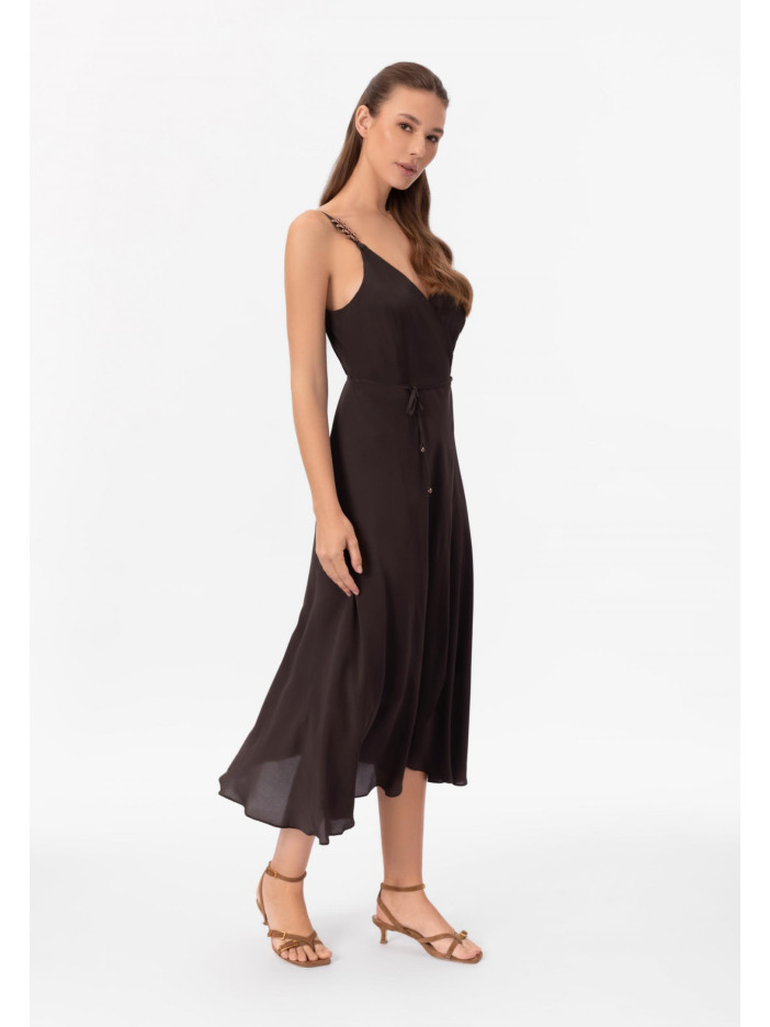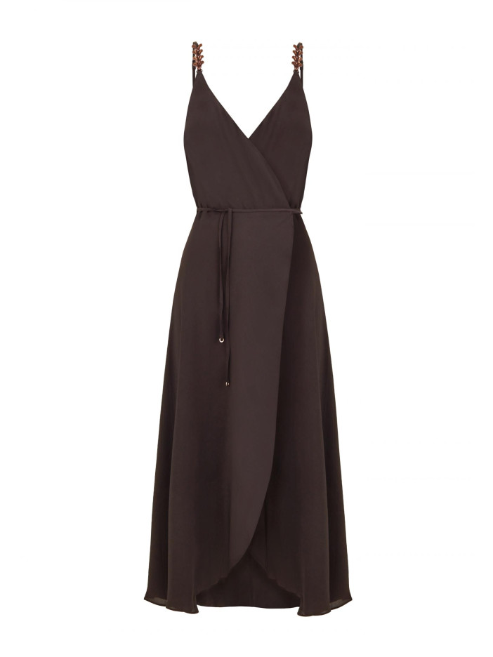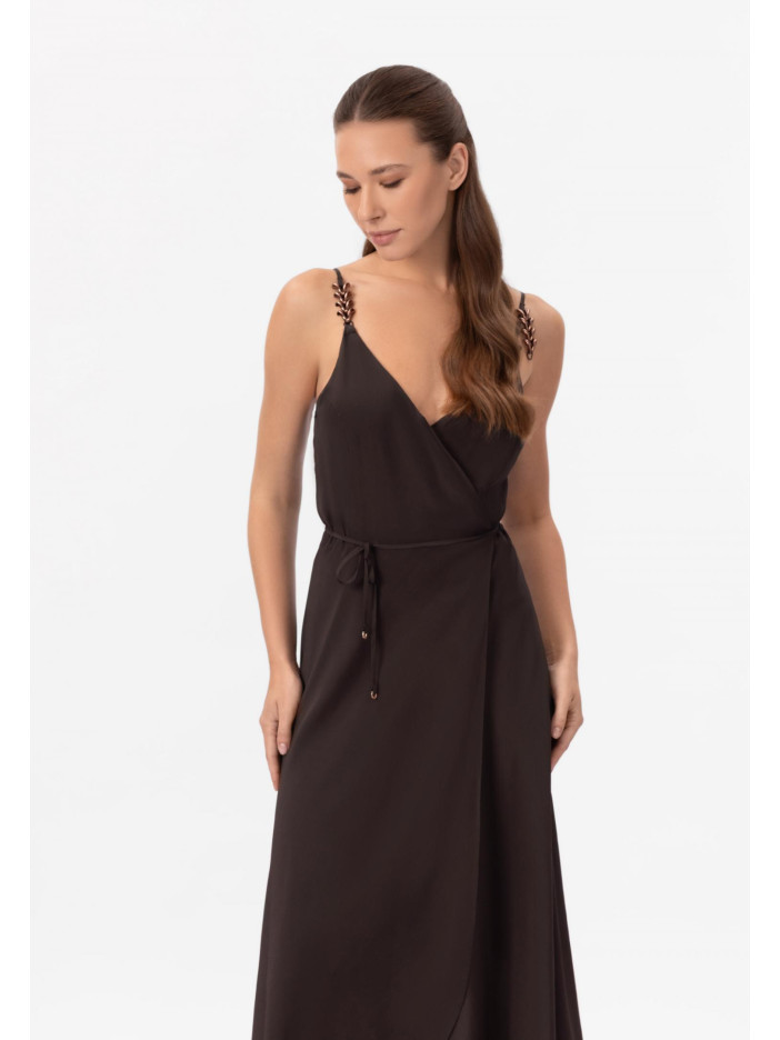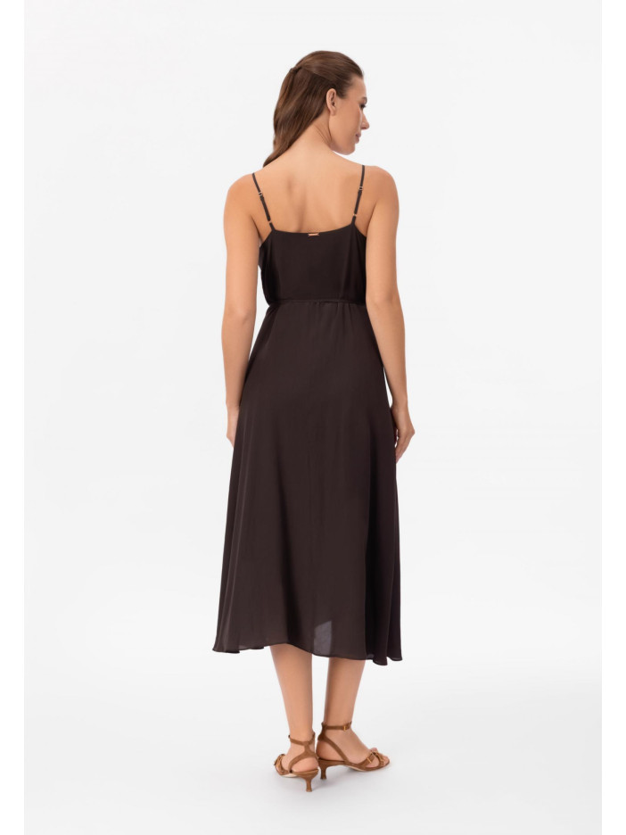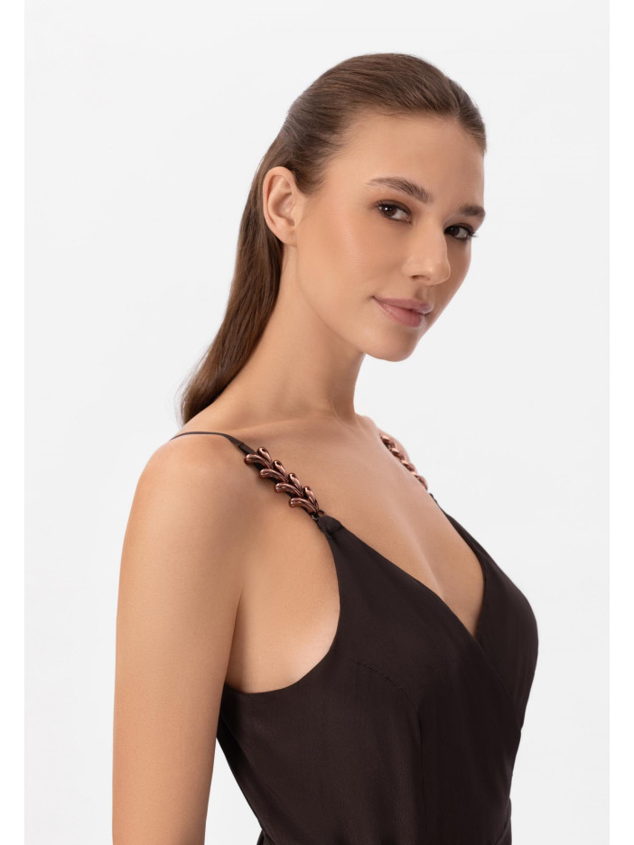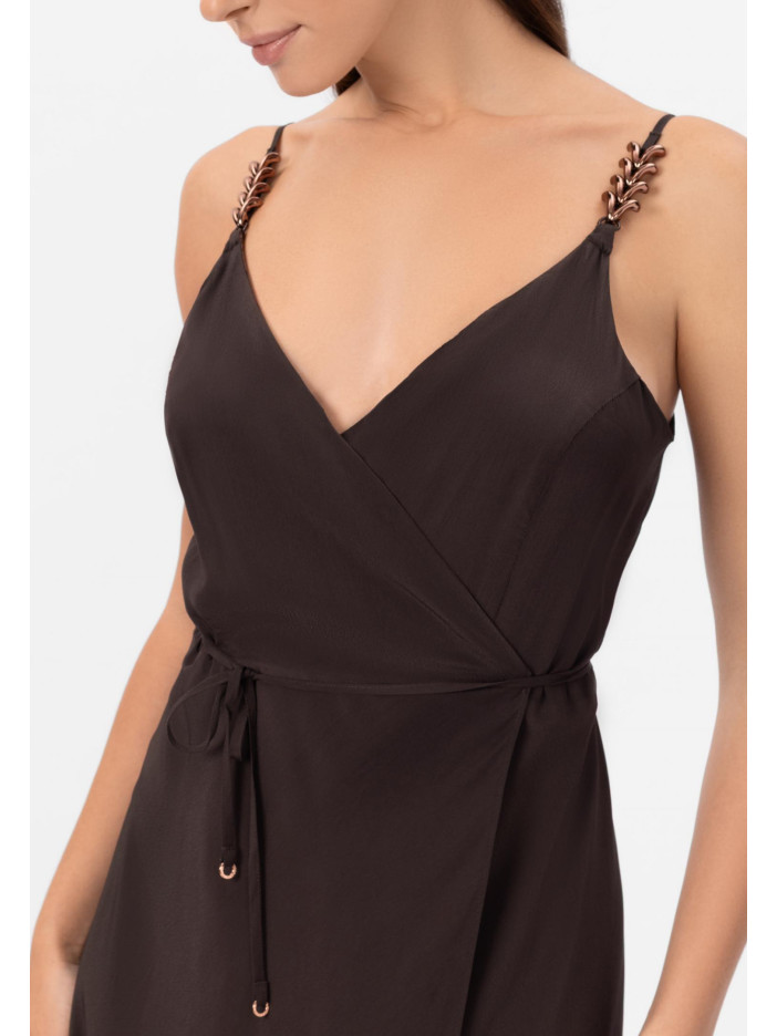 Уникальная серия HYPNOTIC — это завораживающая элегантность и продуманный стиль в каждой детали: глубокий шоколадный оттенок придаёт образу благородство и глубину, а аксессуары в роскошных бронзовых тонах создают эффектный акцент и завершённость, лёгкое платье-сарафан на запах выполнено из нежного сочетания вискозы и шёлка, приятно струится по фигуре и подчёркивает её линии, тонкие регулируемые бретели с изящным декоративным элементом добавляют утончённости, V-образный вырез красиво акцентирует декольте, а длина ниже колена формирует элегантный, женственный силуэт — идеальный выбор для особых моментов и стильного повседневного образа
