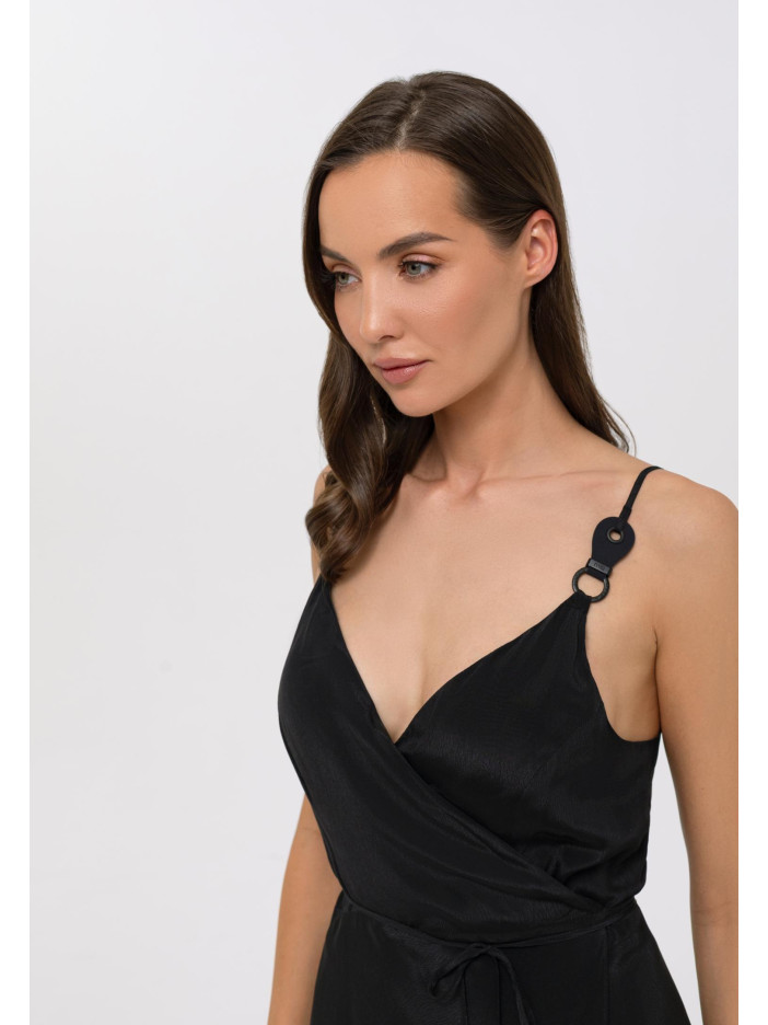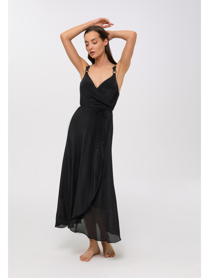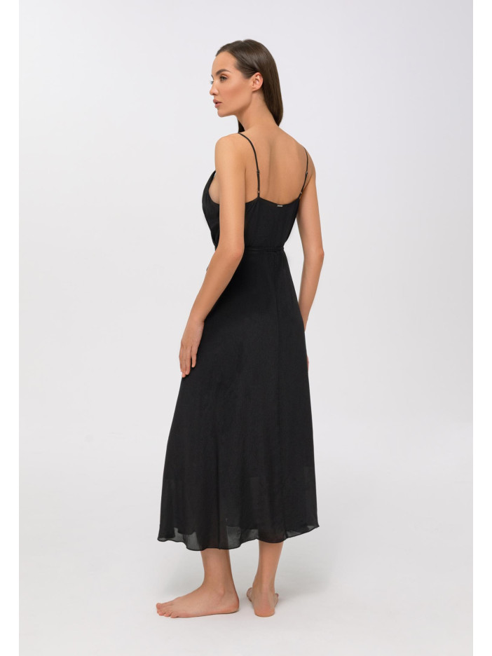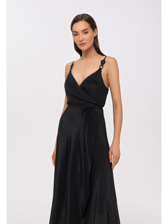 Серия FRENCH CODE — это вечная классика в изысканном исполнении «чёрное на чёрном», где глубина оттенка раскрывается через богатую текстуру ткани с рельефными волнистыми жаккардовыми полосками, создающими чувственный и притягательный эффект, интригу усиливает смарагдово-зелёная подкладка с деликатным сатиновым блеском и матовые чёрные аксессуары, добавляющие образу оригинальности и глубины, лёгкий сарафан на запах из вискозы и шёлка на тонких регулируемых бретелях с декоративными элементами подчёркивает женственность, V-образный вырез акцентирует декольте, а асимметричный низ и длина ниже колена формируют элегантный, динамичный силуэт