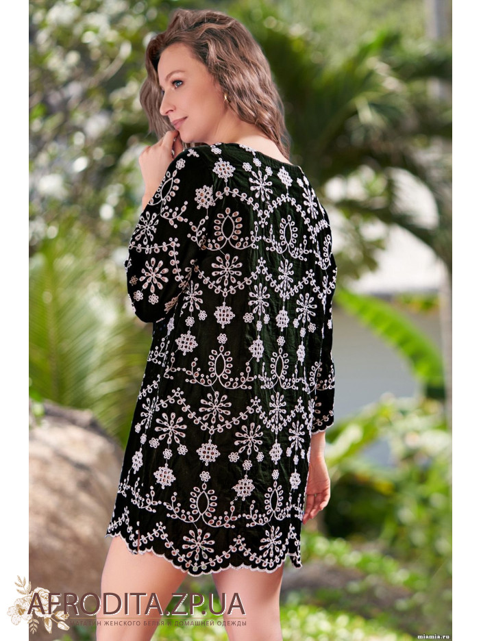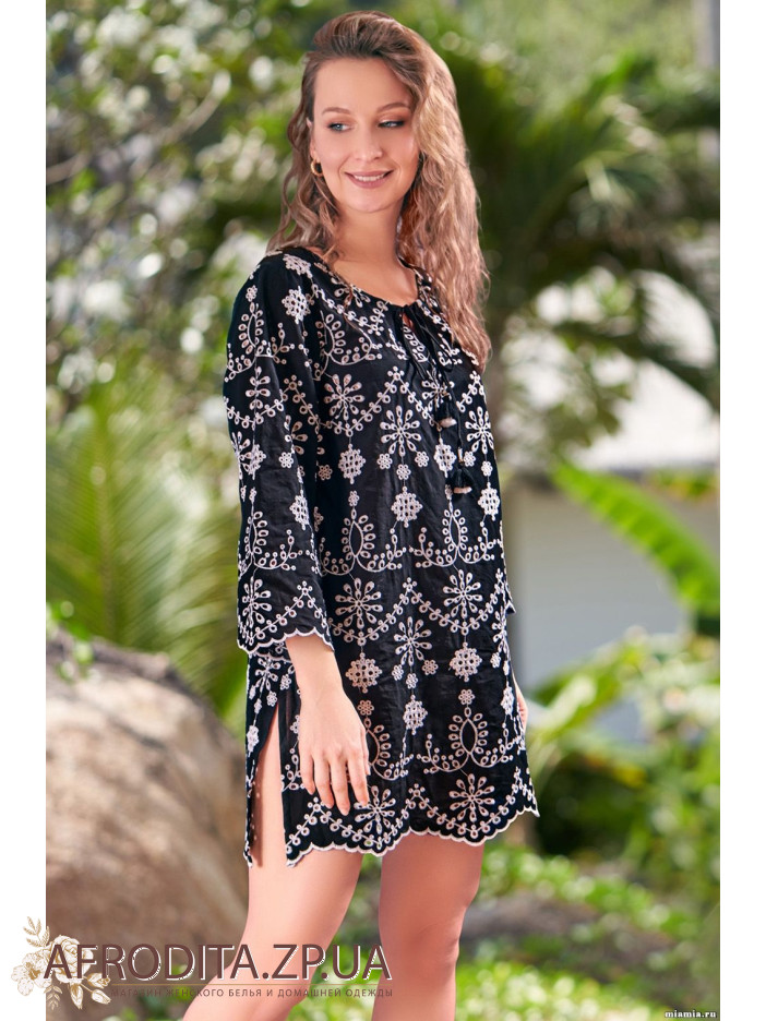 Туника Нуар 1335 от Mia-Amore длиной чуть выше колена с длинным рукавом, выполнена из натурального вышивного хлопка. Ширину выреза можно регулировать за счет завязок с декоративными кисточками на концах. В боковых швах обработаны карманы. По низу расположены разрезы.