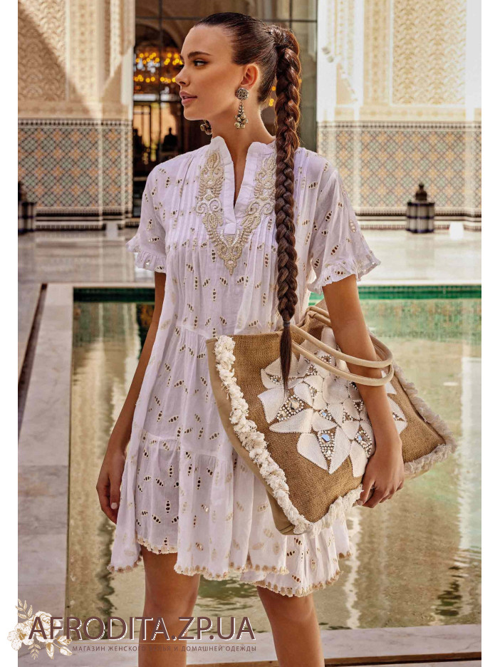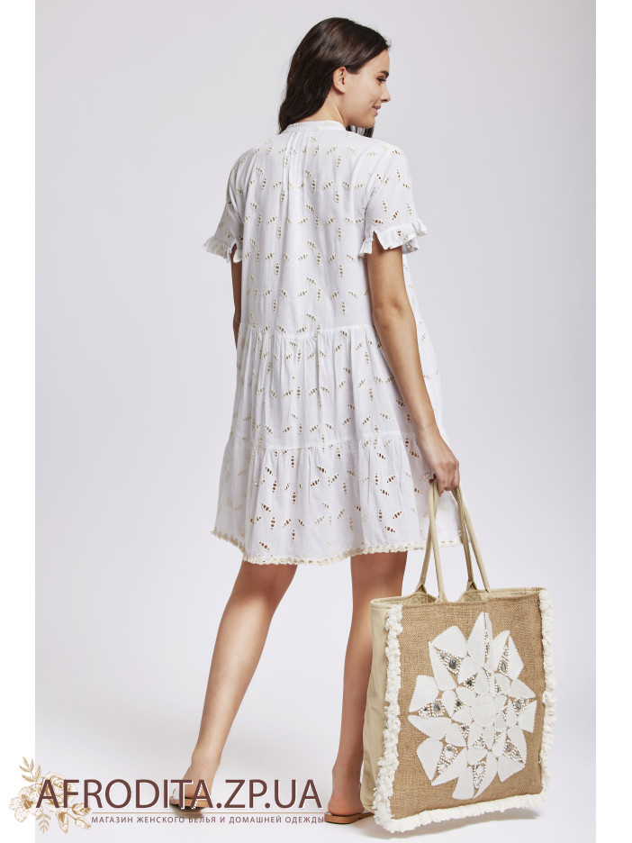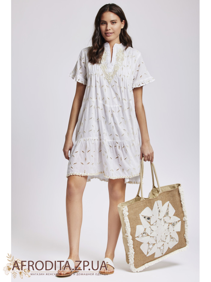 Туника-платье Iconique IC24-013 выше колен изготовленная из высококачественного хлопка. Рукав короткий и расклешенный по краям, область декольте декорирована вышивкой. Горловина имеет  V-образную форму.