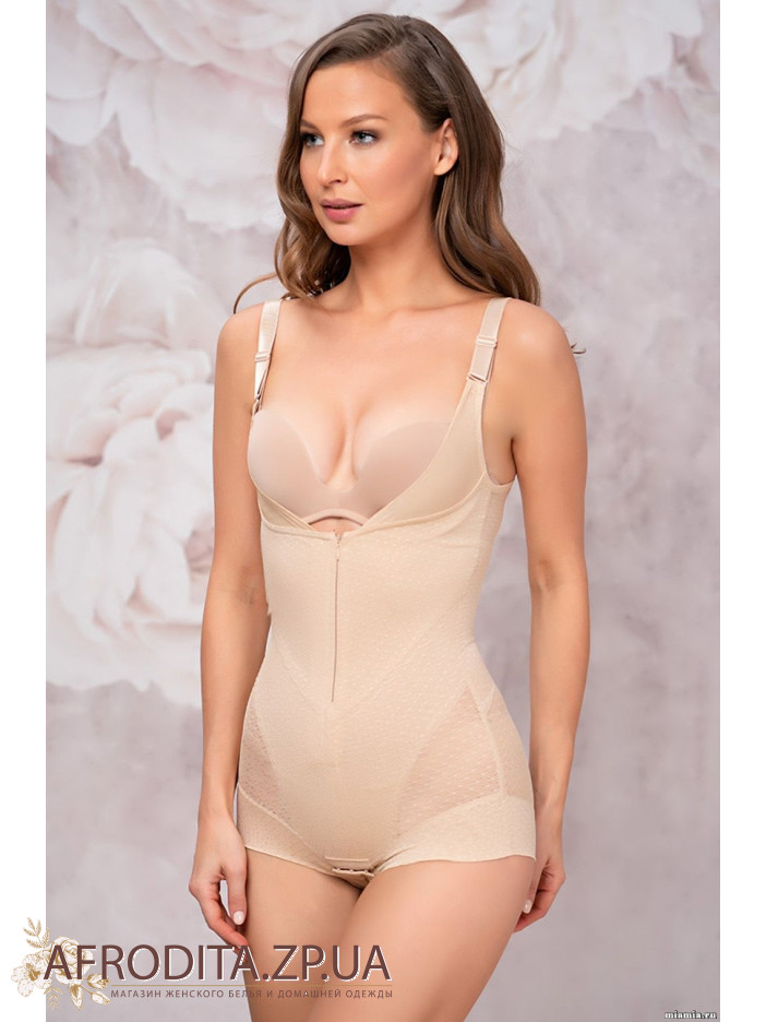 Коригувальне боді Mia-Diva 578. Відкрита зона декольте піднімає груди знизу і з боків, дозволяючи окремо підібрати бюстгальтер. Додаткове зусилля у сфері талії коригує лінію талії, підтягує живіт. Бретели та застібка на ластівці регулюються. Завдяки проклеїнним плоским зрізам, краї боді не видно через одяг. Так само в області грудей є блискавка, що дозволяє зручно вдягати та фіксувати виріб.