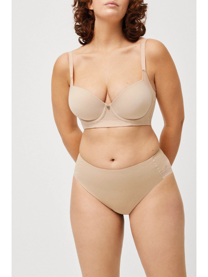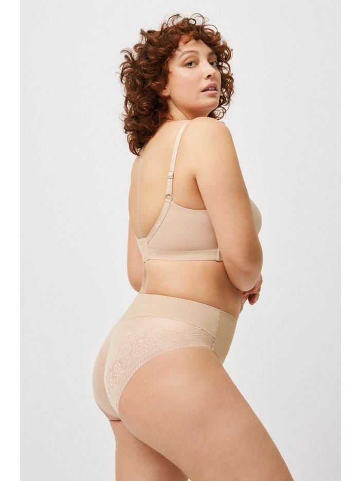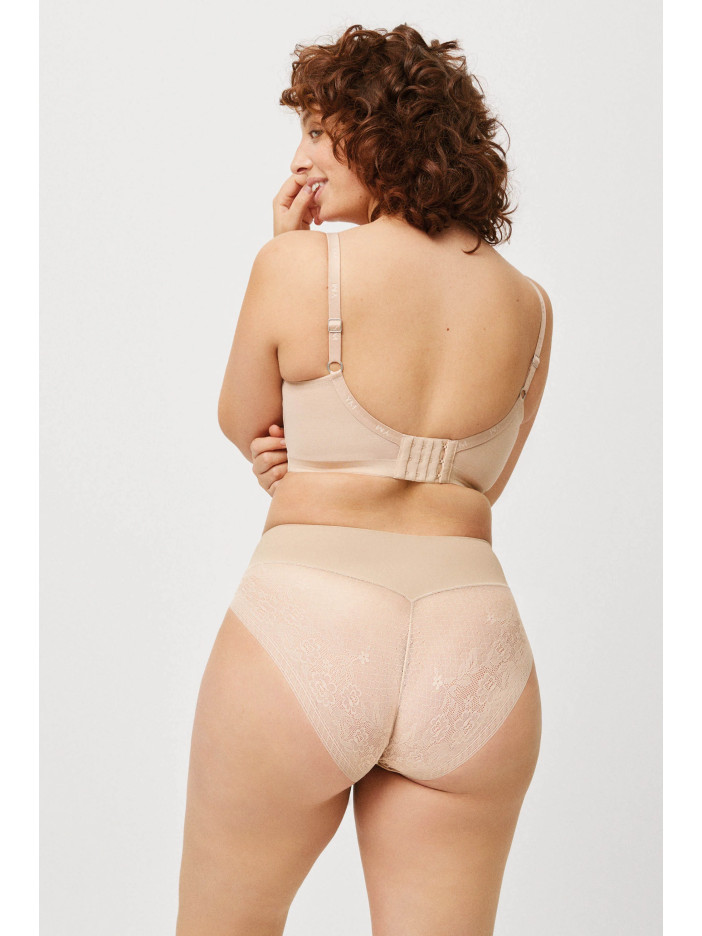 Коригувальні труси тілесного кольору комфортної посадки виконані з тонкого, пружного та еластичного полотна, яке м'яко прилягає до тіла та забезпечує впевнену підтримку без відчуття стягнутості. Посилена зона корекції в області живота допомагає сформувати більш стрункий і підтягнутий силует, а гладка передня частина залишається непомітною навіть під тонким одягом, що облягає. Безшовна мережива задня деталь красиво підкреслює форми і виключає видимі лінії, додаючи образу жіночності. Бавовняна ластівка дарує додатковий комфорт та відчуття свіжості, дозволяючи почуватися впевнено та елегантно щодня.